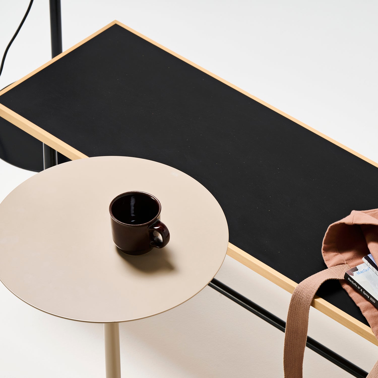 組立式のスチール脚に、カラーMDF とヒノキを使用した座面を合わせたベンチです。