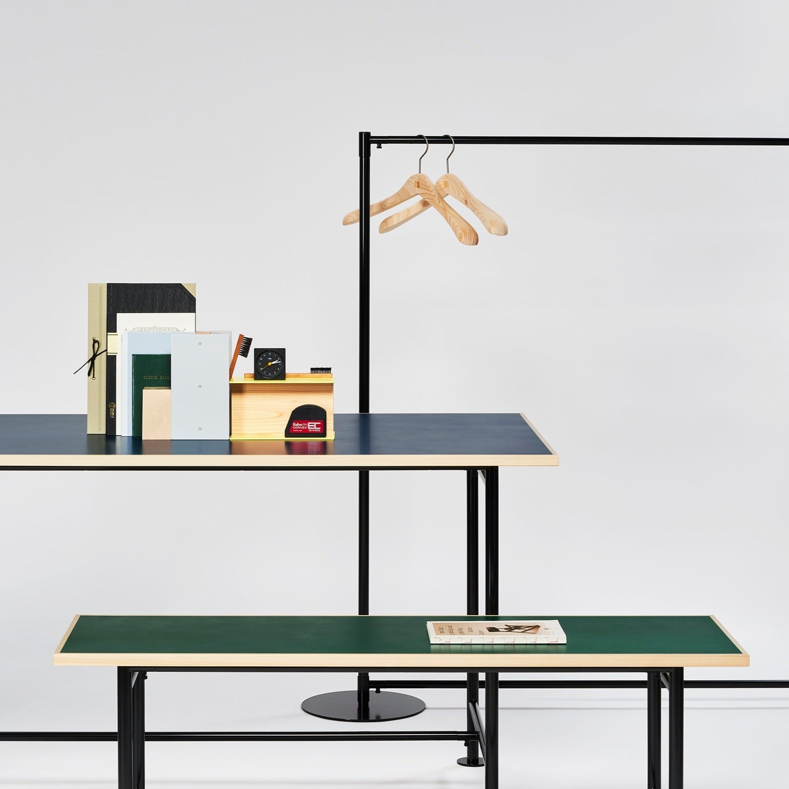 コート12着程度をバランス良くかけられ、フラットなベースで足元の引っかかりも少なく、使い勝手の良いデザインです。