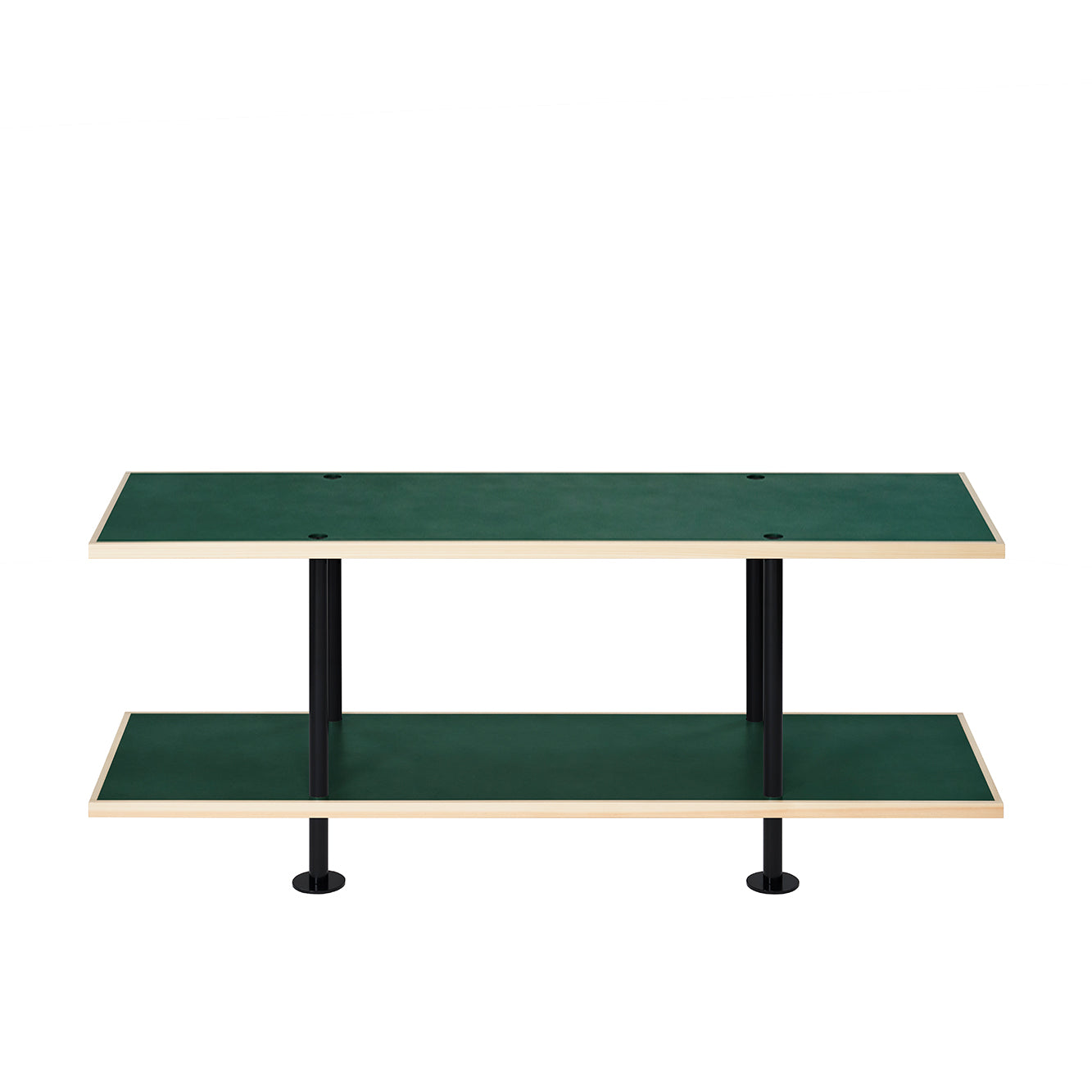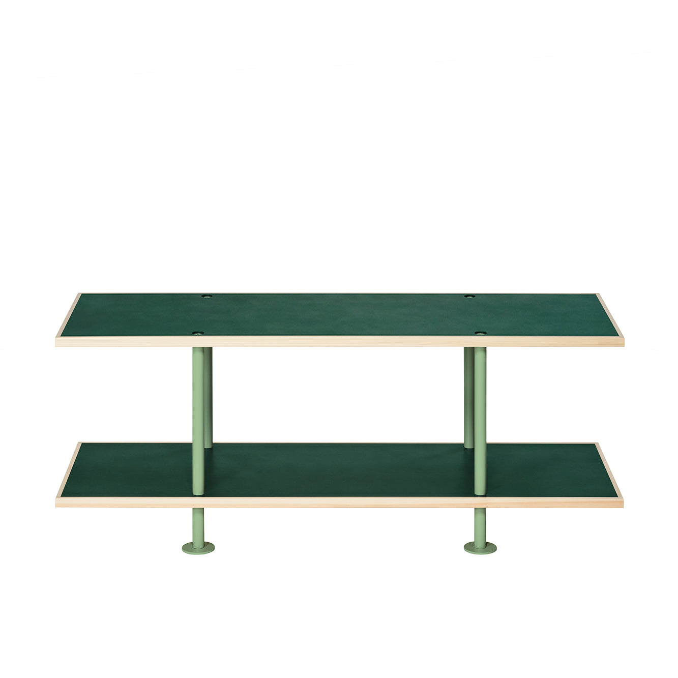 組立式のスチール脚に、カラーMDF とヒノキを使用した棚板を合わせたシェルフです。