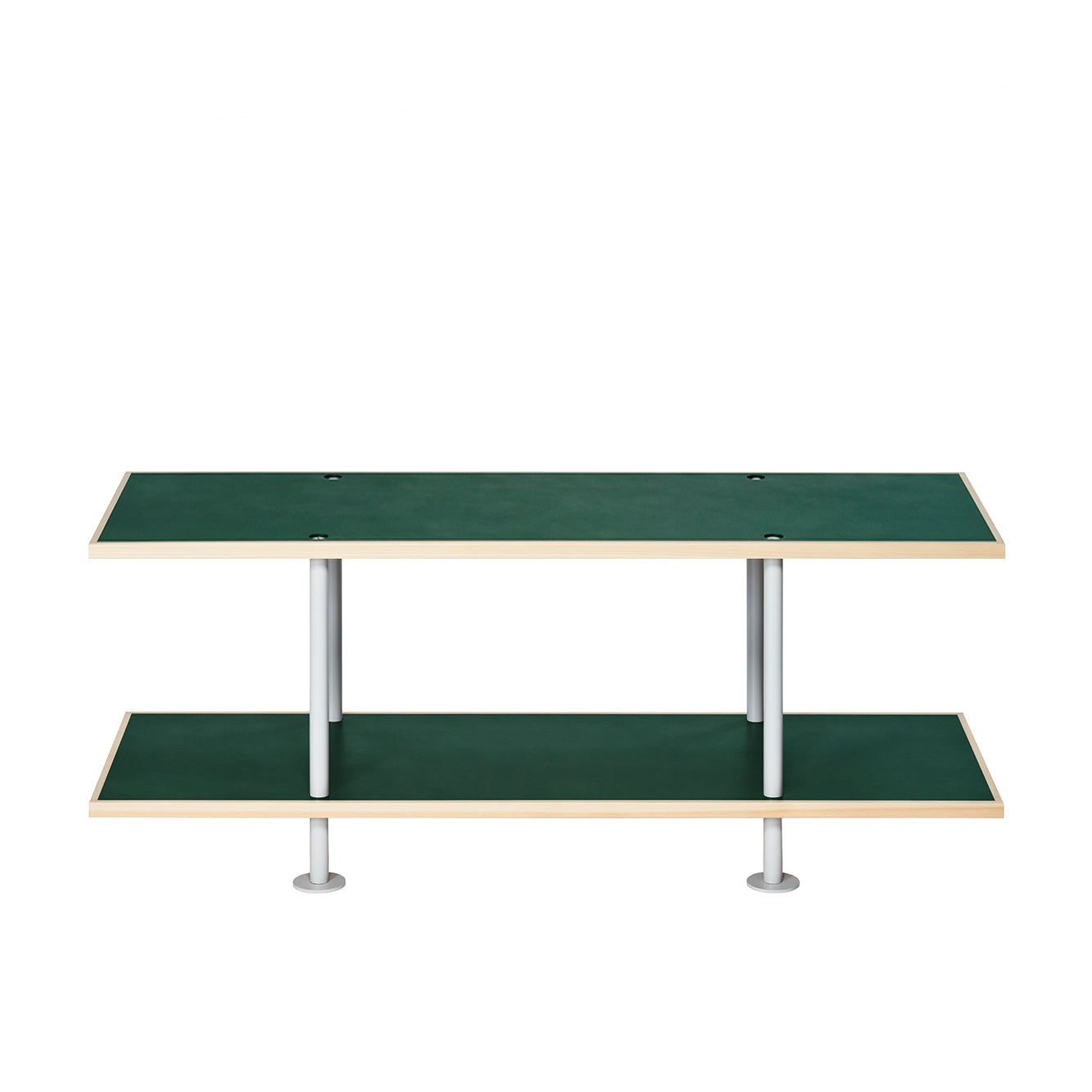 上下の支柱で棚板を挟むシンプルな構造ながら、しっかりとした強度があり、パーツの増減によって2段~4段まで組み替えが可能です。