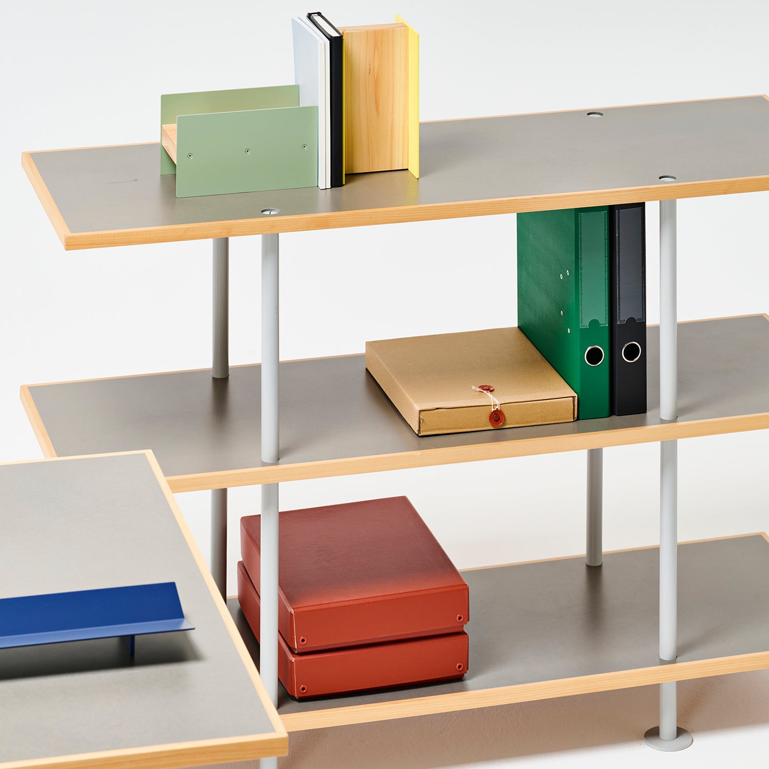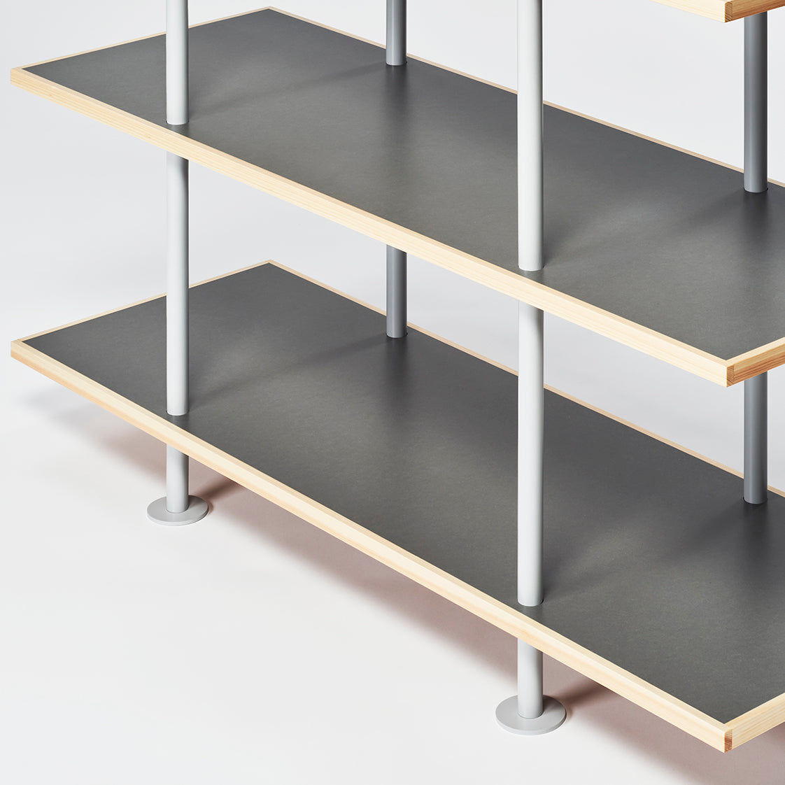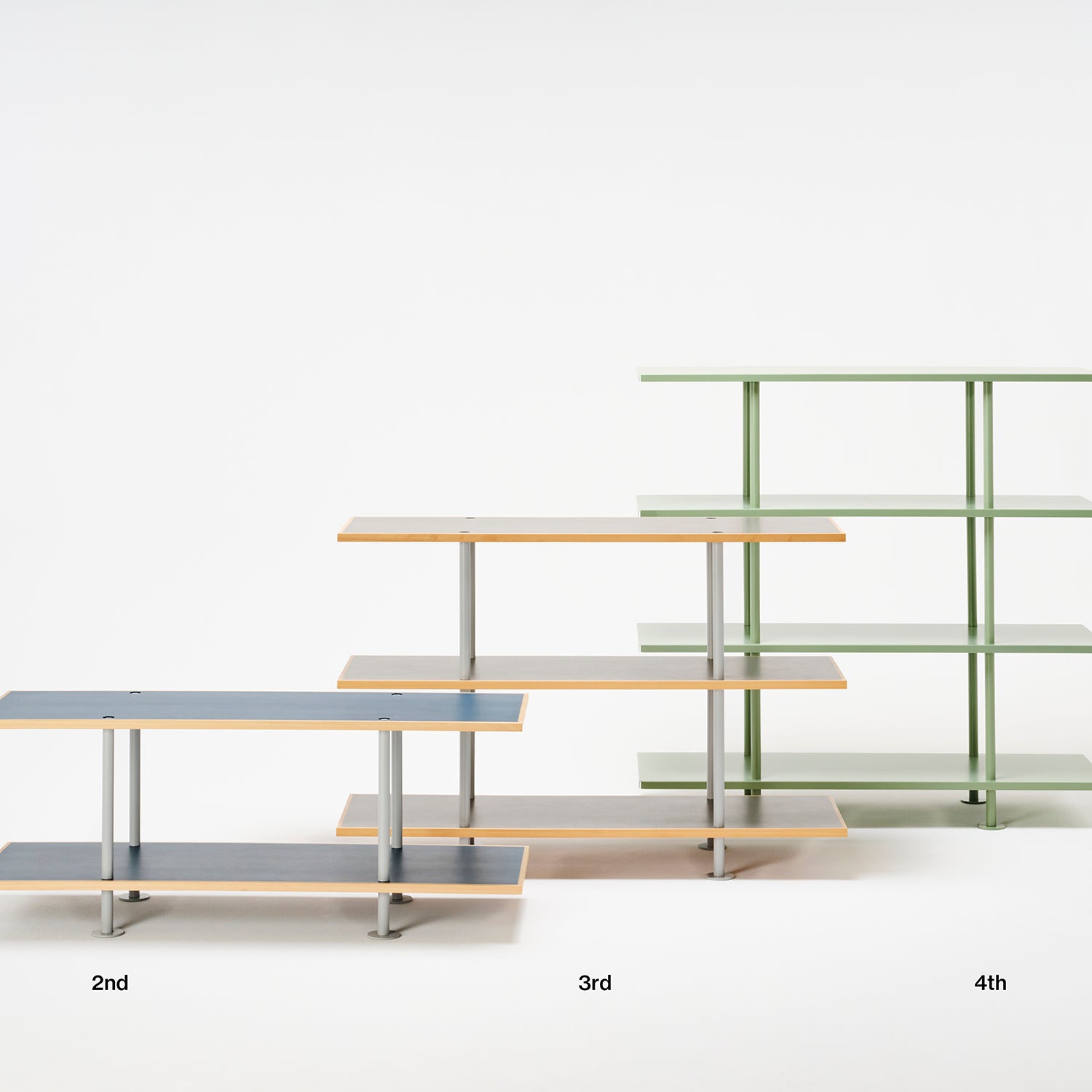 上下の支柱で棚板を挟むシンプルな構造ながら、しっかりとした強度があり、パーツの増減によって2段~4段まで組み替えが可能です。