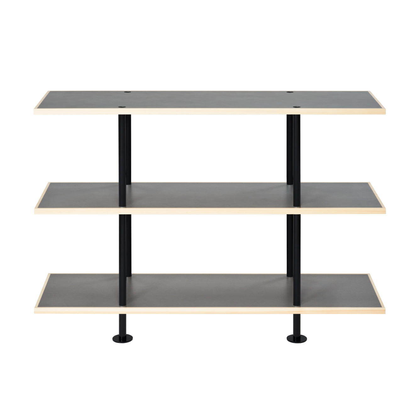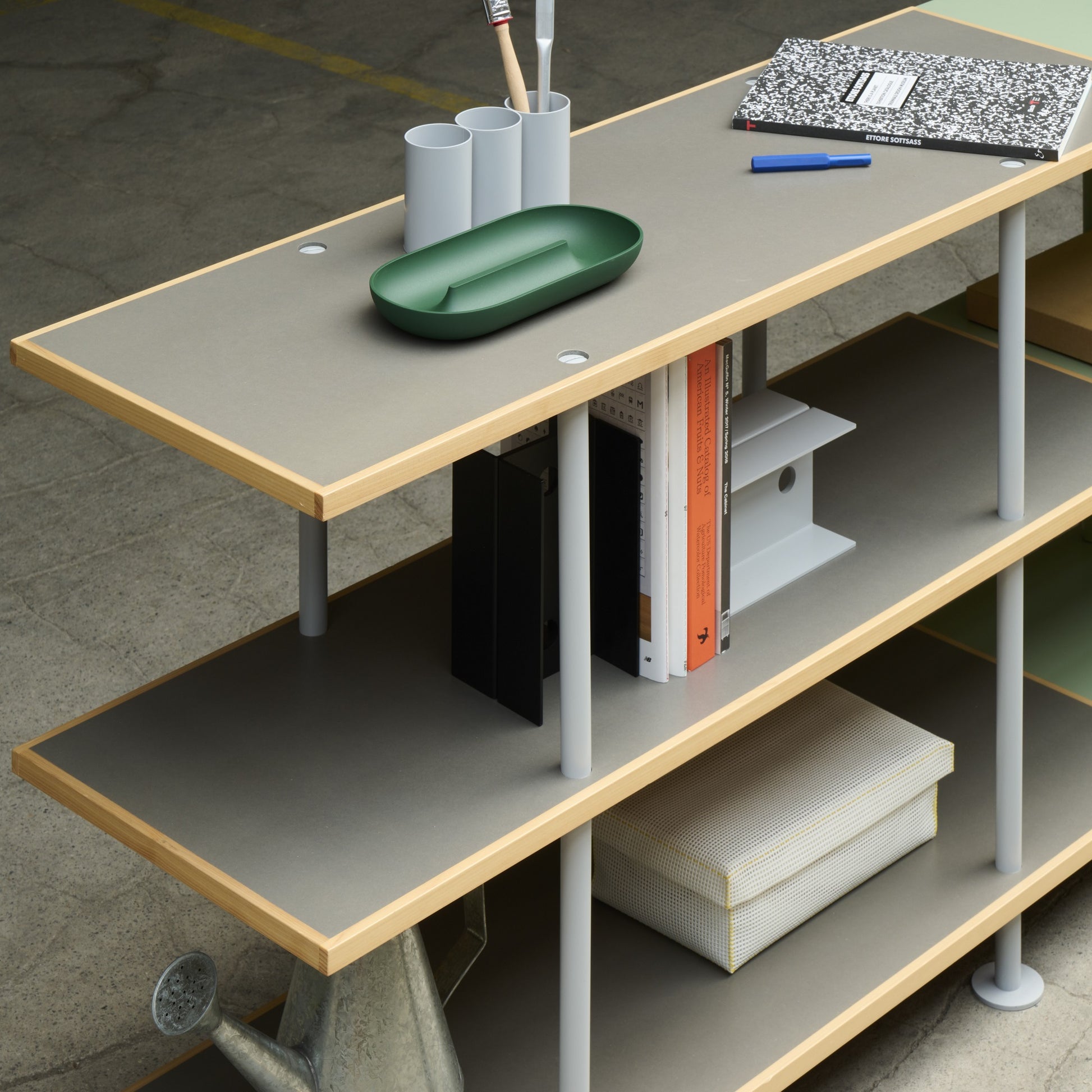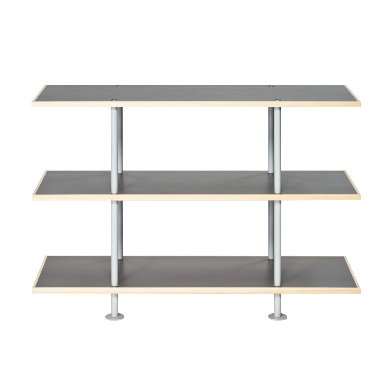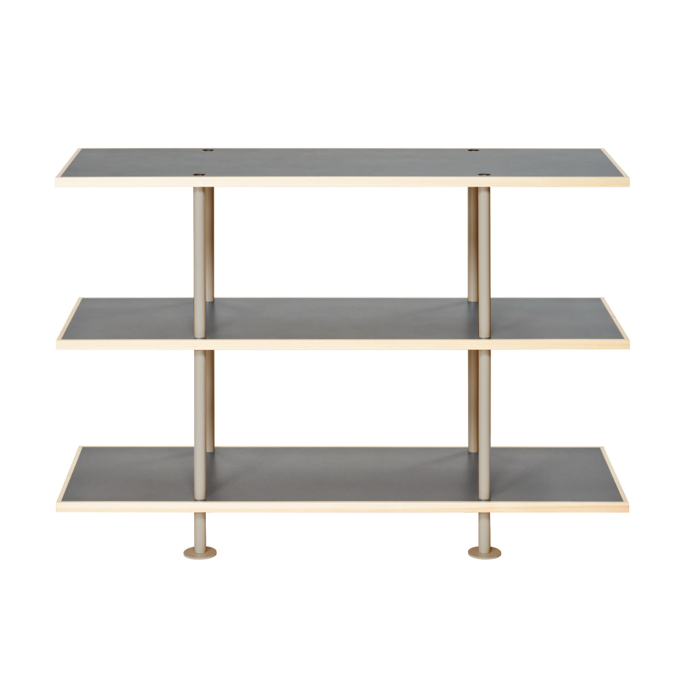 上下の支柱で棚板を挟むシンプルな構造ながら、しっかりとした強度があり、パーツの増減によって2段~4段まで組み替えが可能です。