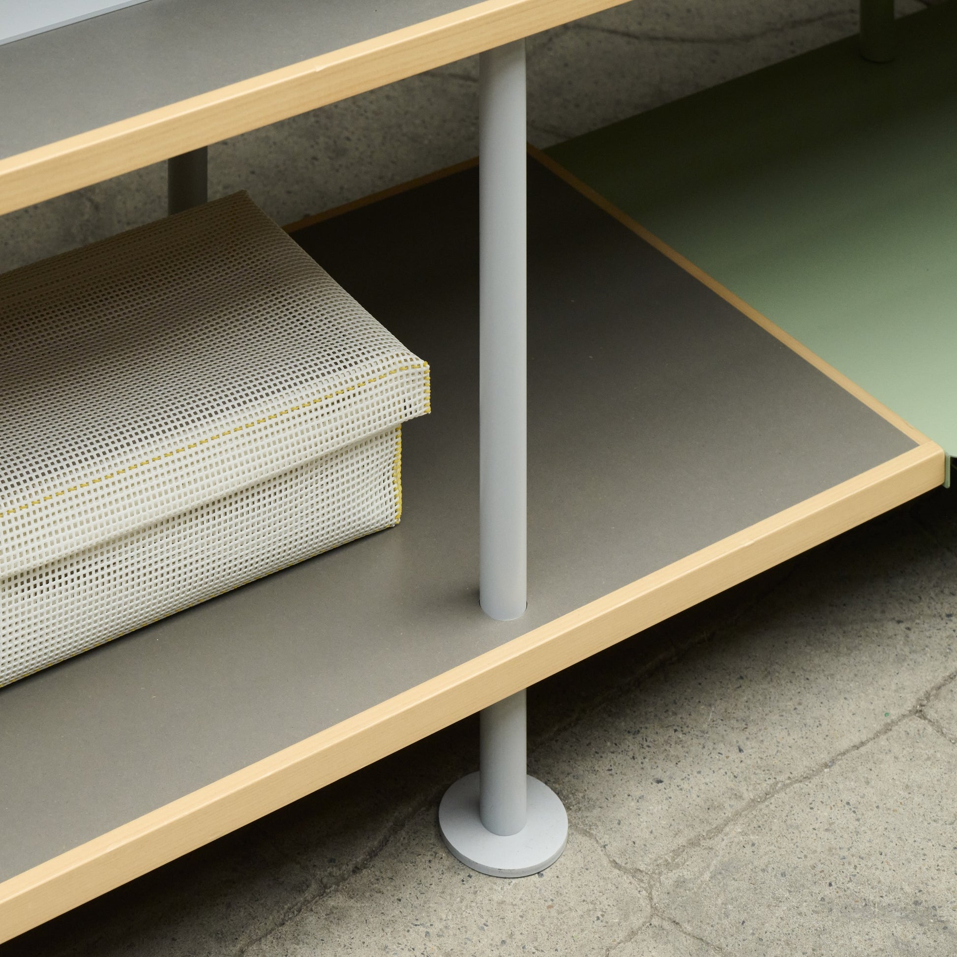 組立式のスチール脚に、カラーMDF とヒノキを使用した棚板を合わせたシェルフです。