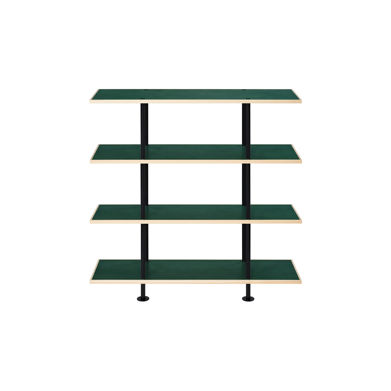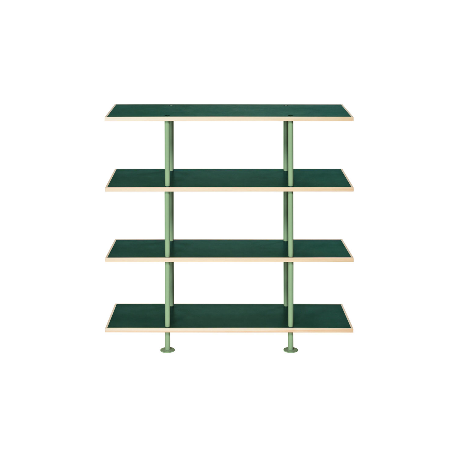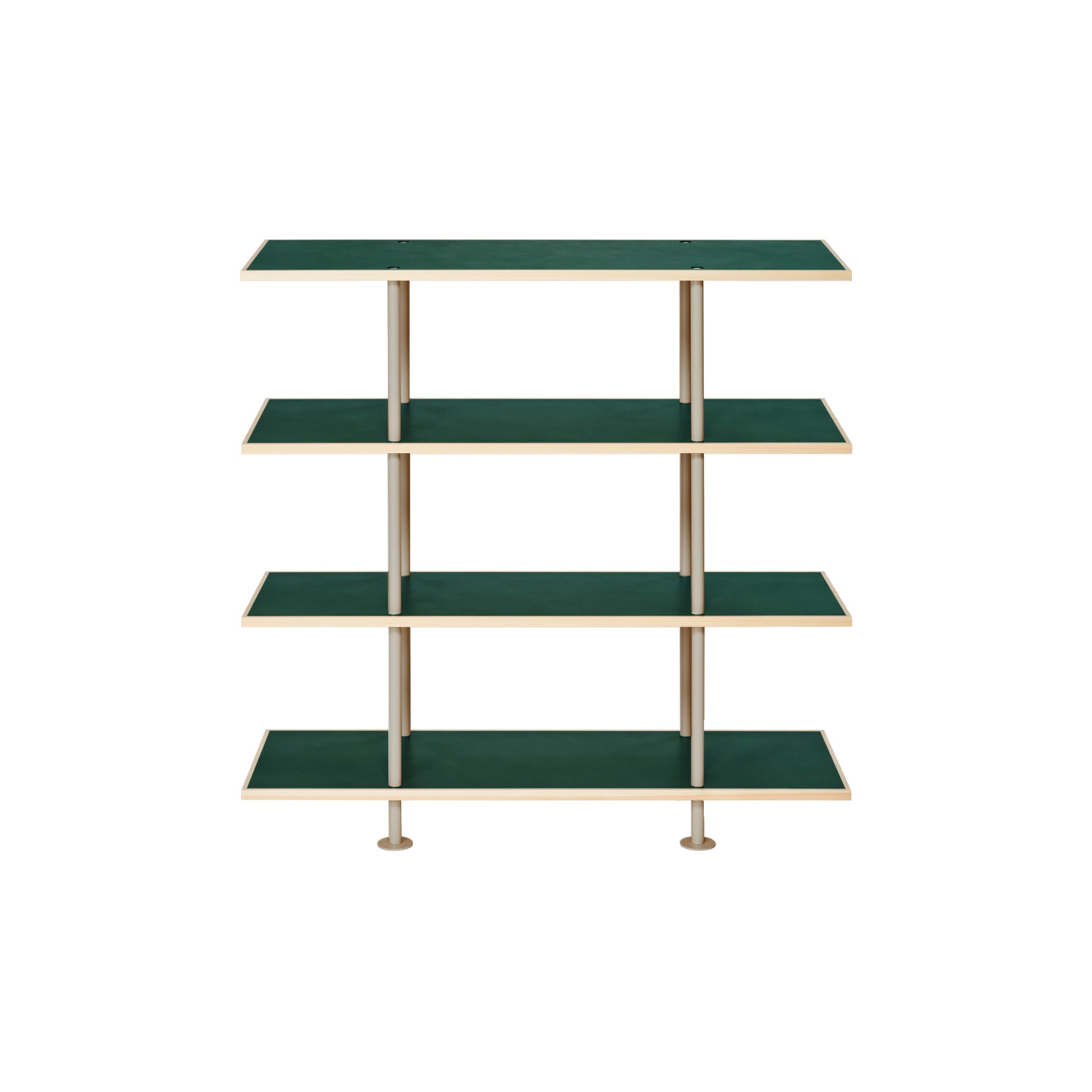 組立式のスチール脚に、カラーMDF とヒノキを使用した棚板を合わせたシェルフです。