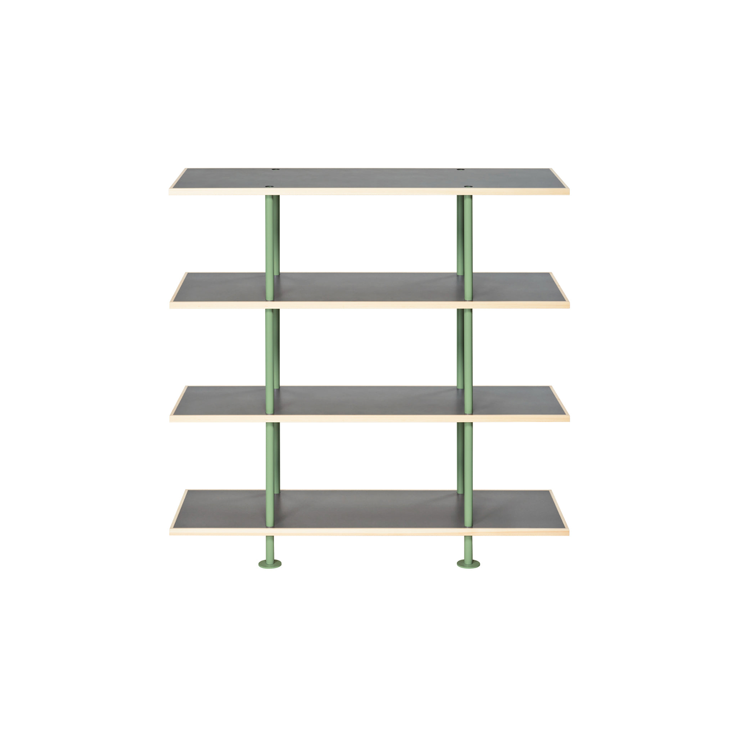 組立式のスチール脚に、カラーMDF とヒノキを使用した棚板を合わせたシェルフです。