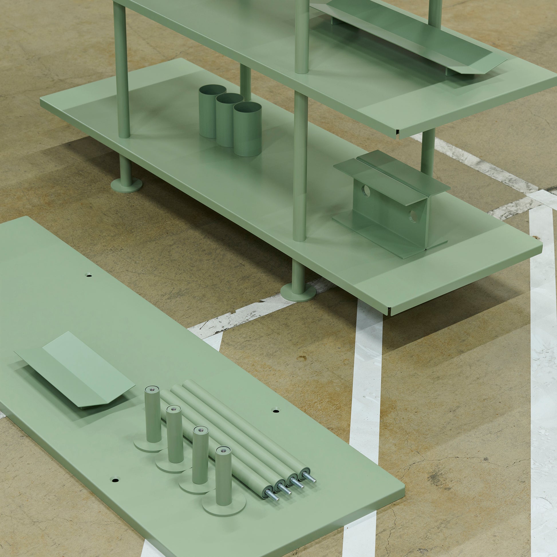 上下の支柱で棚板を挟むシンプルな構造ながら、しっかりとした強度があり、パーツの増減によって2段~4段まで組み替えが可能です。