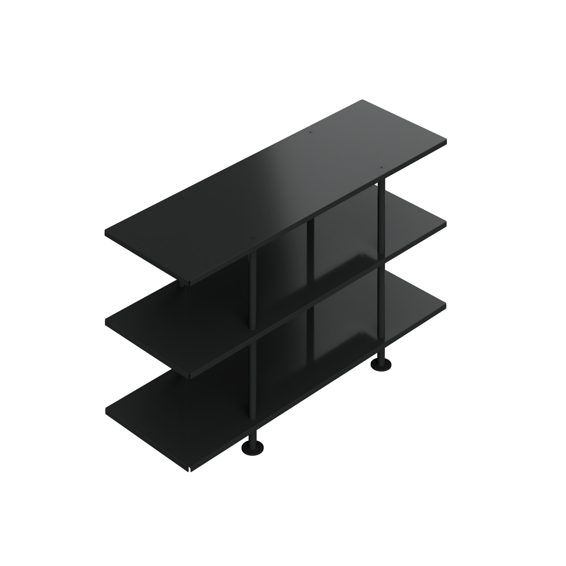 The simple structure consists of shelves sandwiched between upper and lower posts, offering solid strength. The number of tiers can be adjusted between two and four by adding or removing parts.