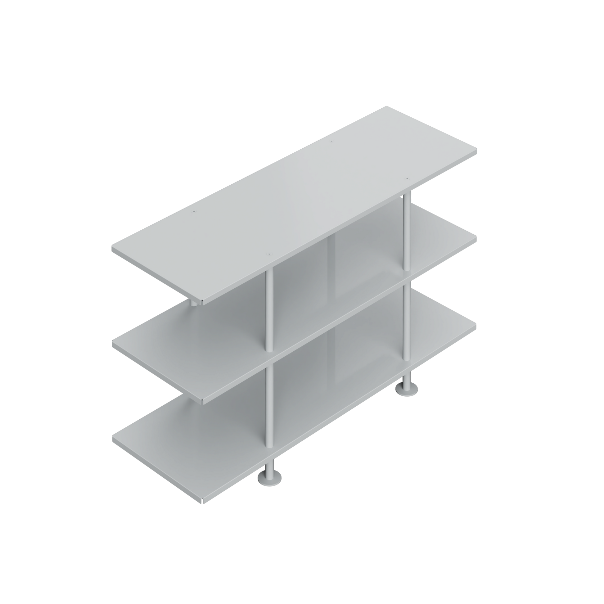 上下の支柱で棚板を挟むシンプルな構造ながら、しっかりとした強度があり、パーツの増減によって2段~4段まで組み替えが可能です。