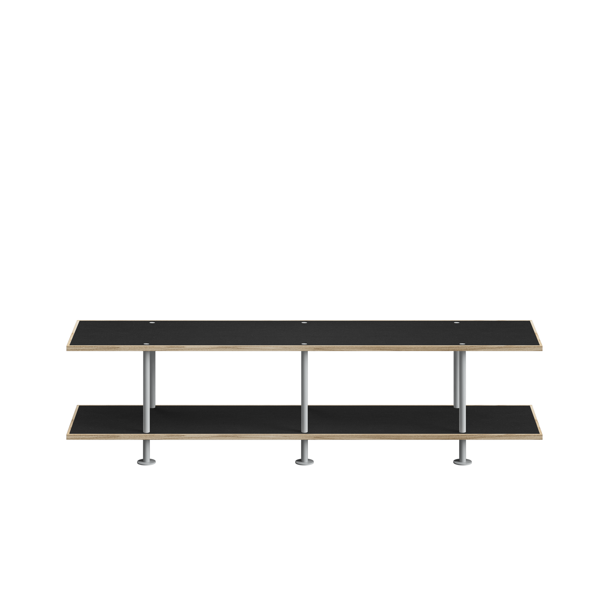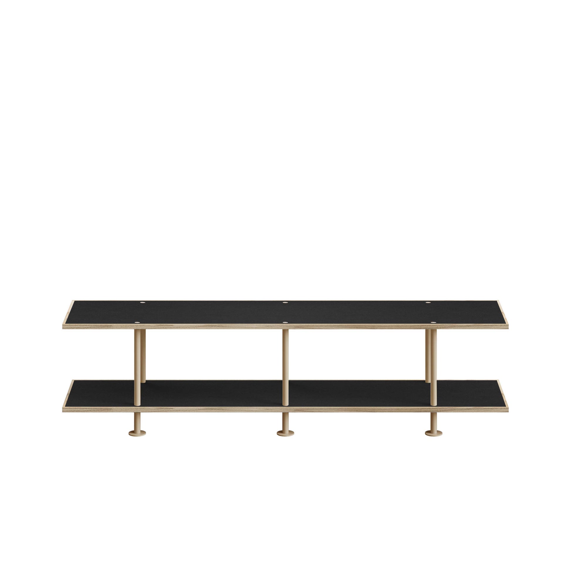 上下の支柱で棚板を挟むシンプルな構造ながら、しっかりとした強度があり、パーツの増減によって2段~4段まで組み替えが可能です。