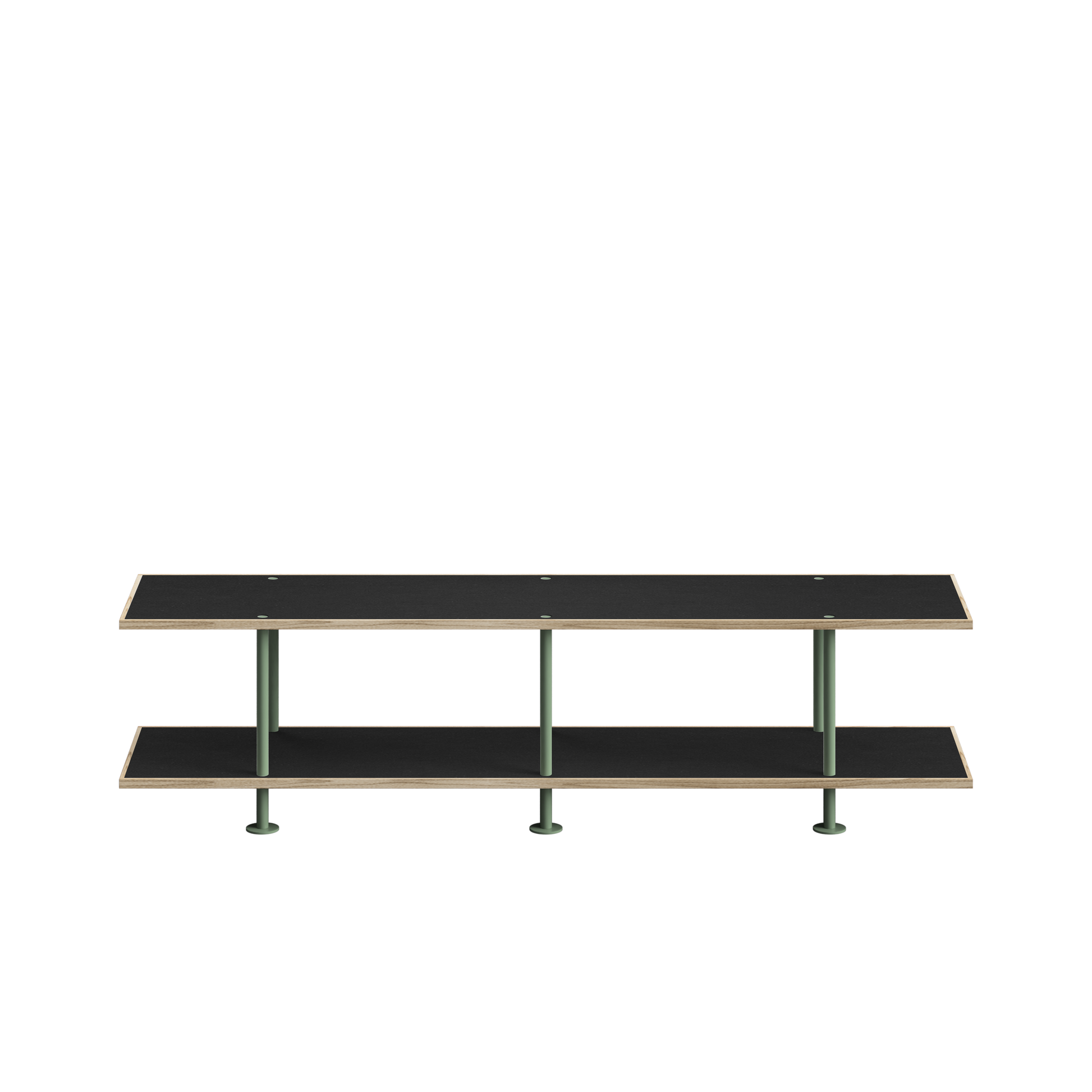 組立式のスチール脚に、カラーMDF とヒノキを使用した棚板を合わせたシェルフです。