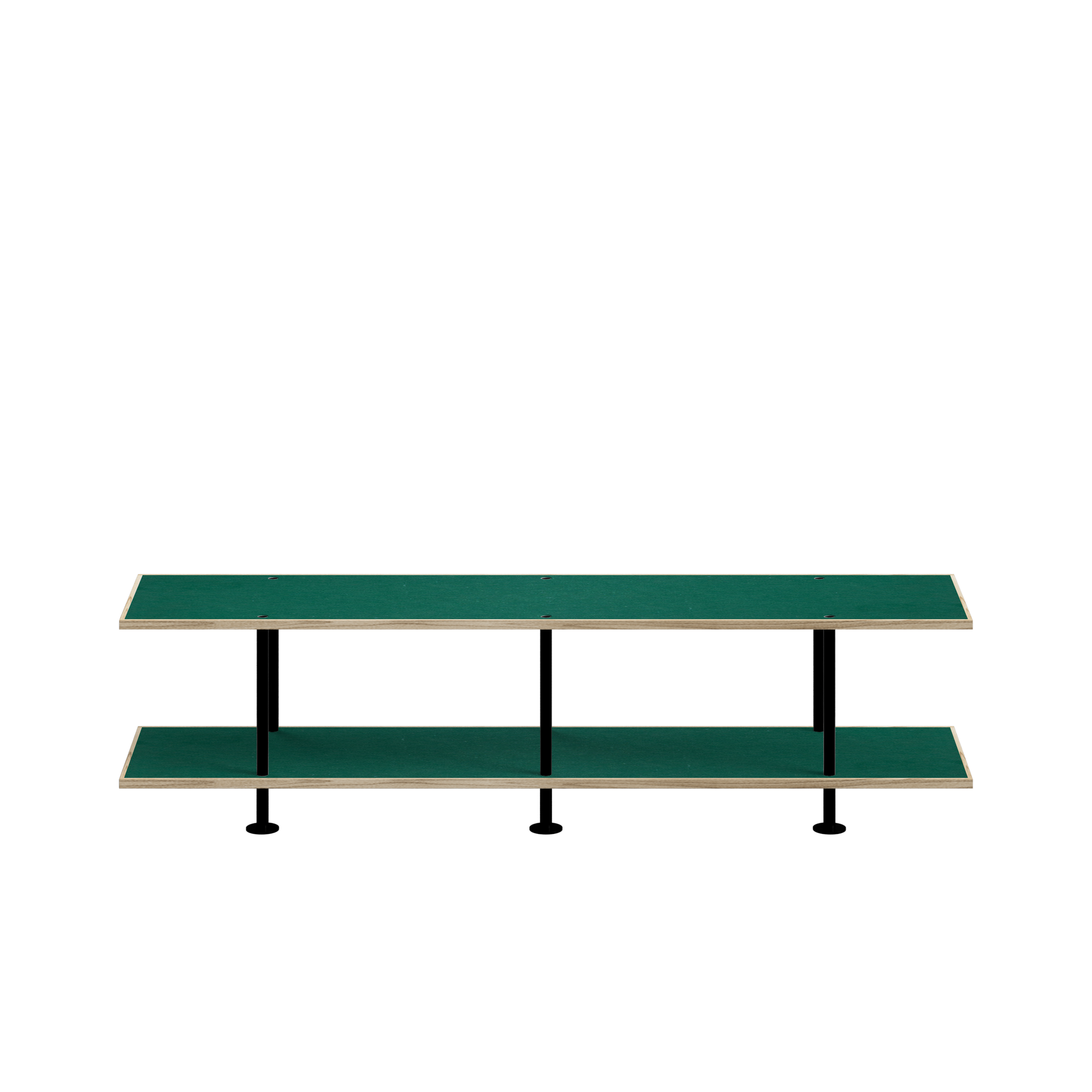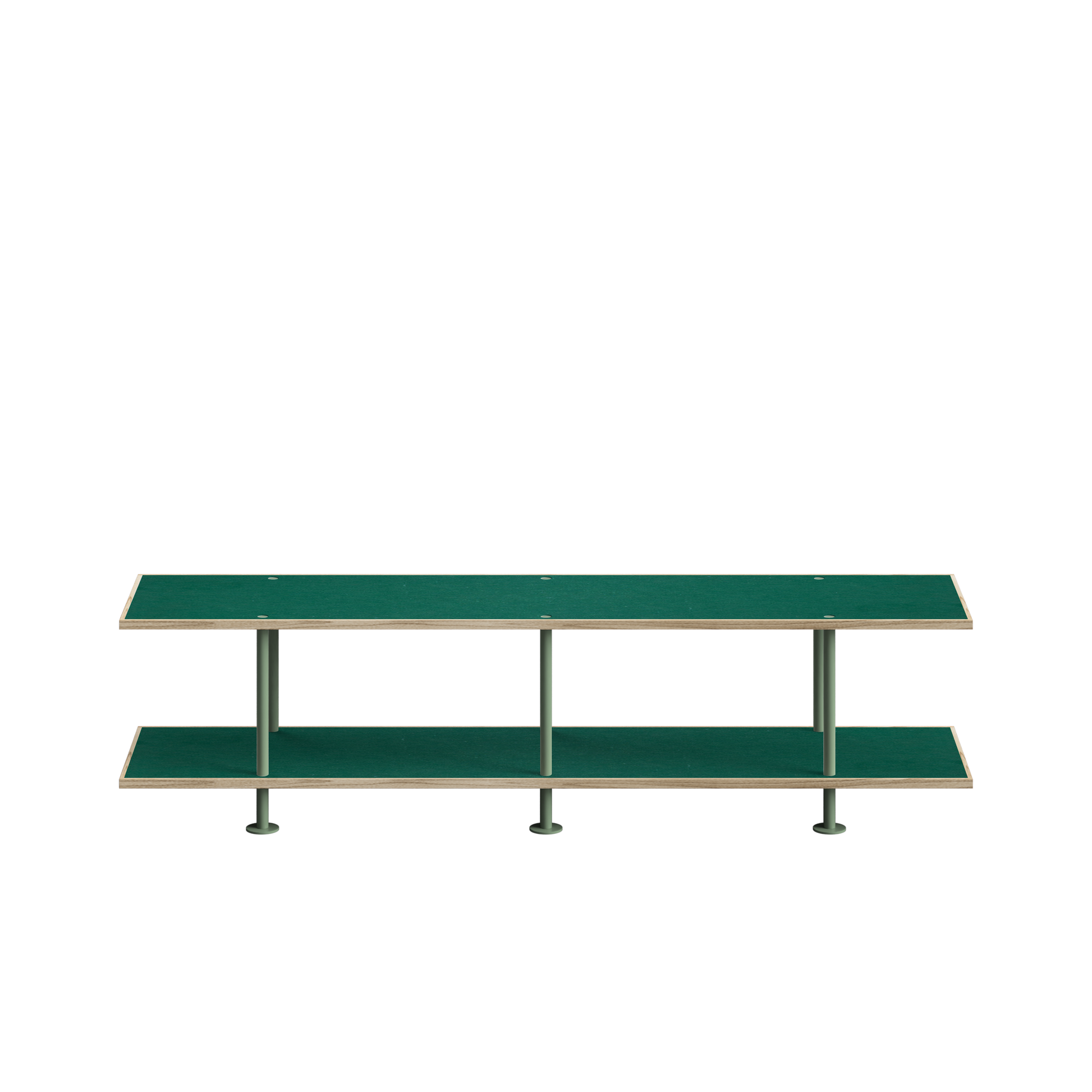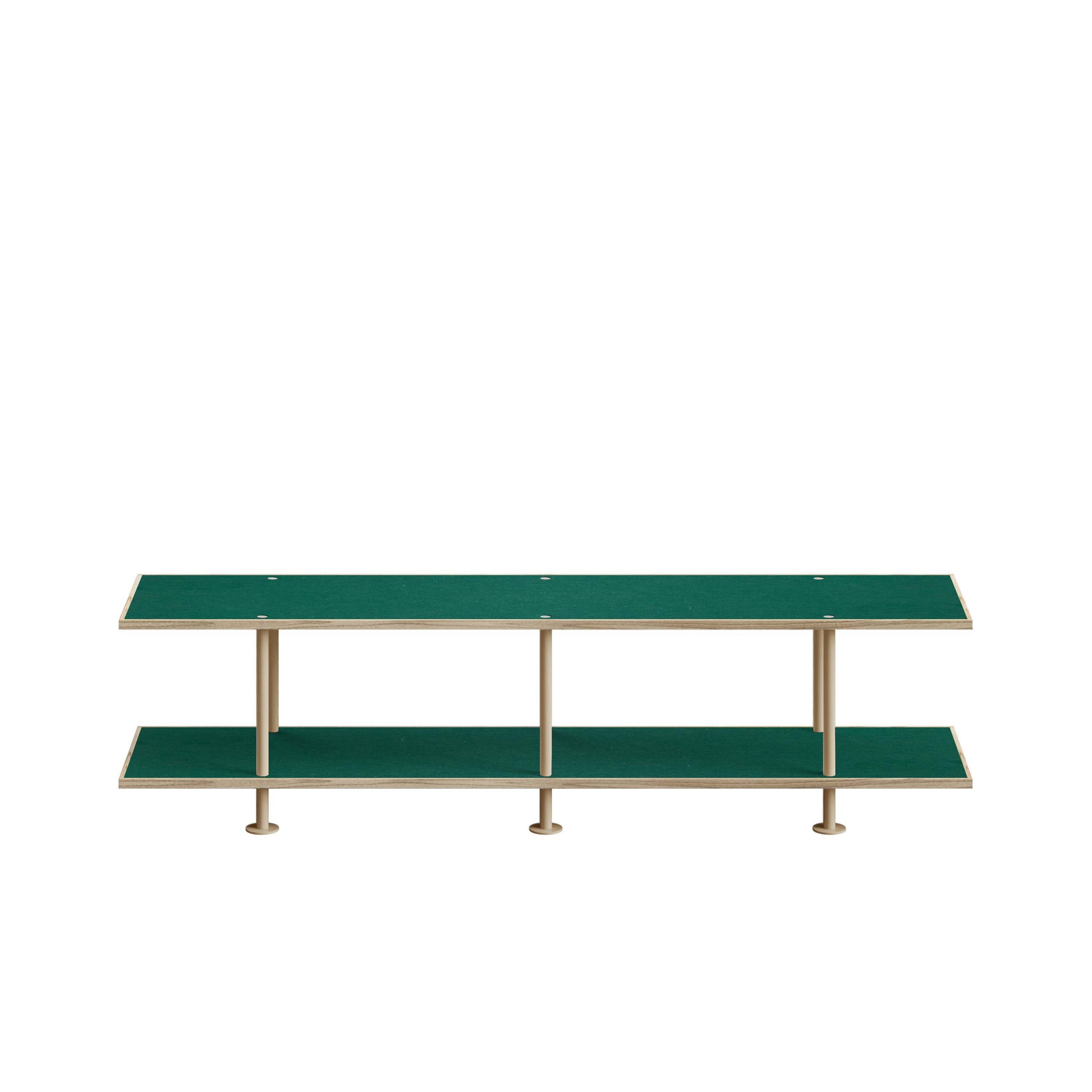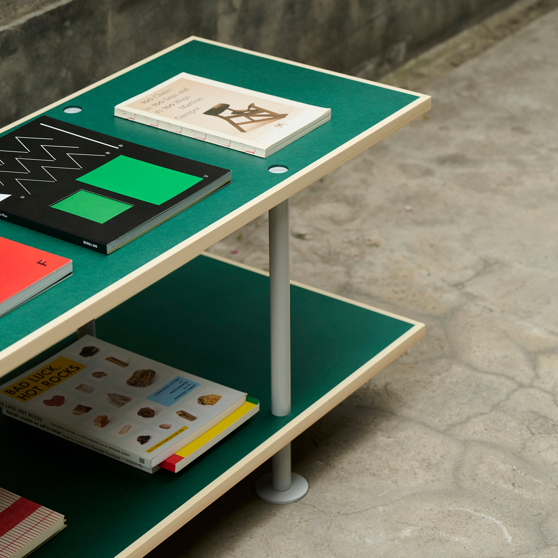 組立式のスチール脚に、カラーMDF とヒノキを使用した棚板を合わせたシェルフです。