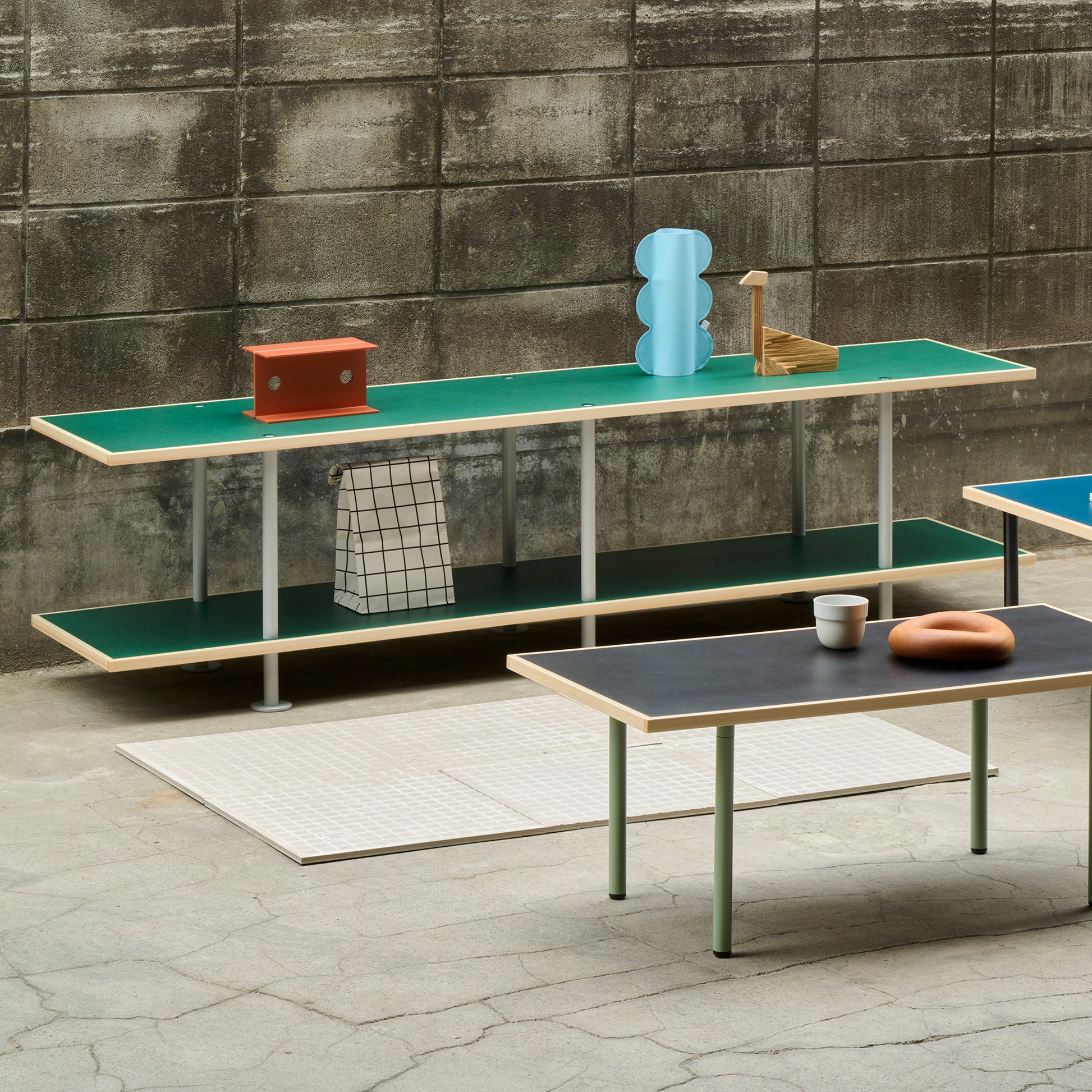 This shelf combines steel assembly-type legs with shelves made of colored MDF and Japanese cypress (hinoki).