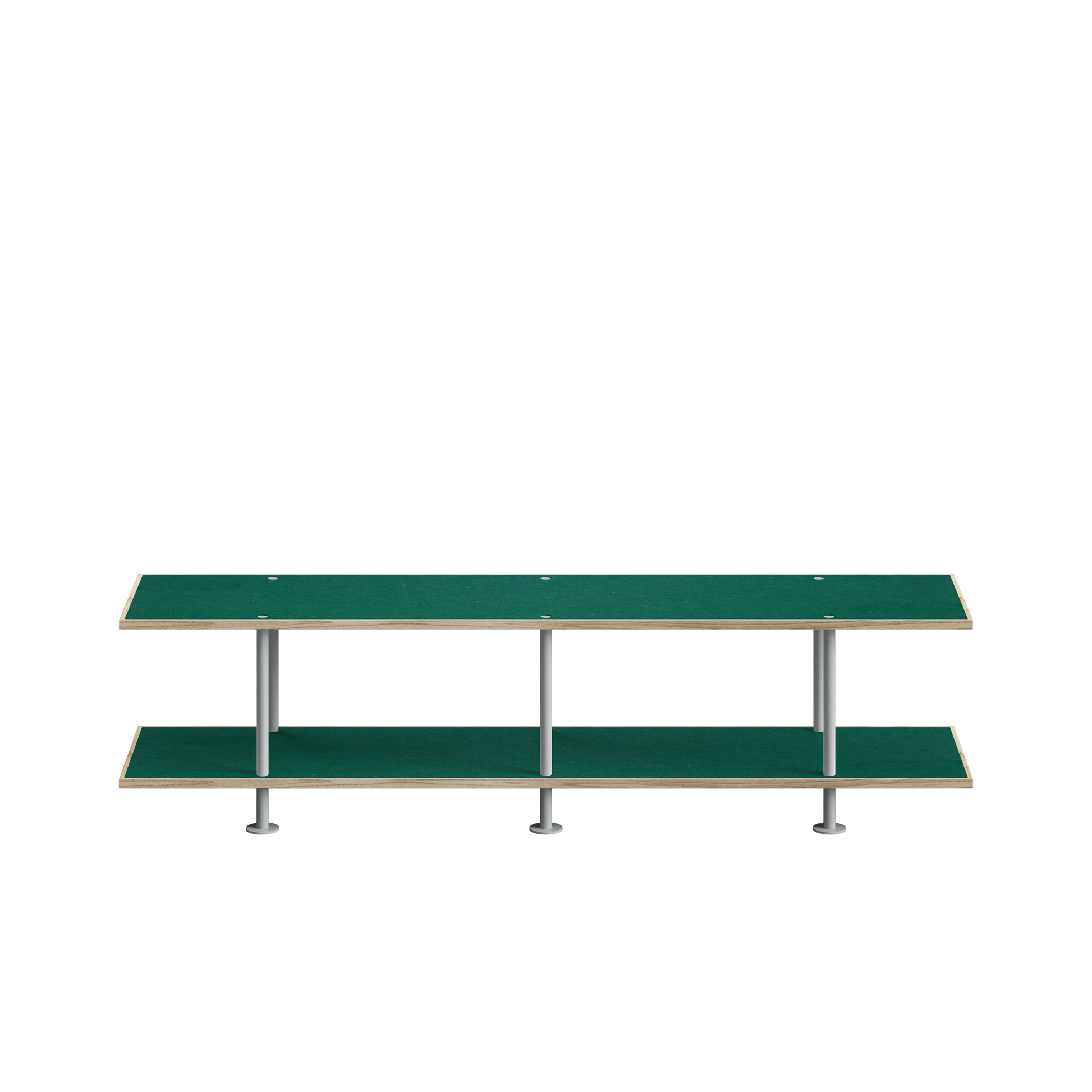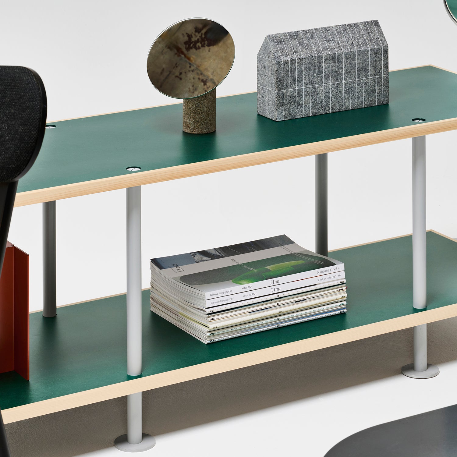 上下の支柱で棚板を挟むシンプルな構造ながら、しっかりとした強度があり、パーツの増減によって2段~4段まで組み替えが可能です。