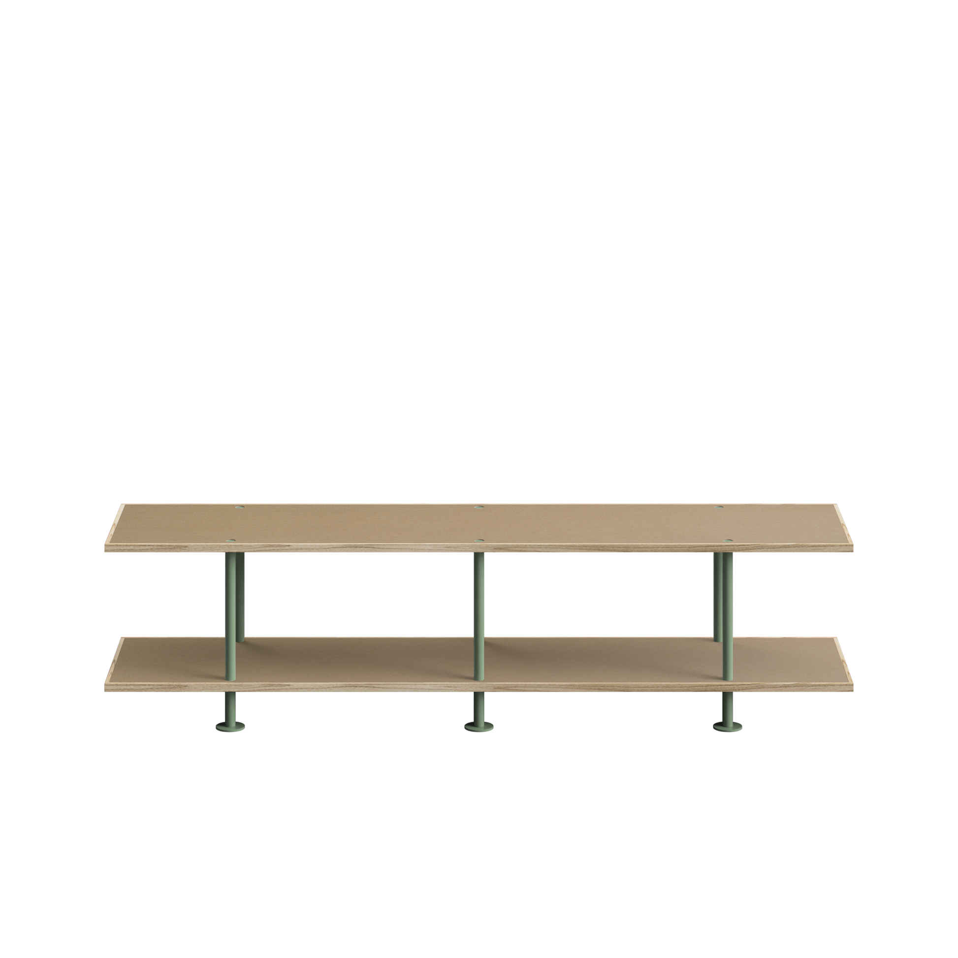 組立式のスチール脚に、カラーMDF とヒノキを使用した棚板を合わせたシェルフです。