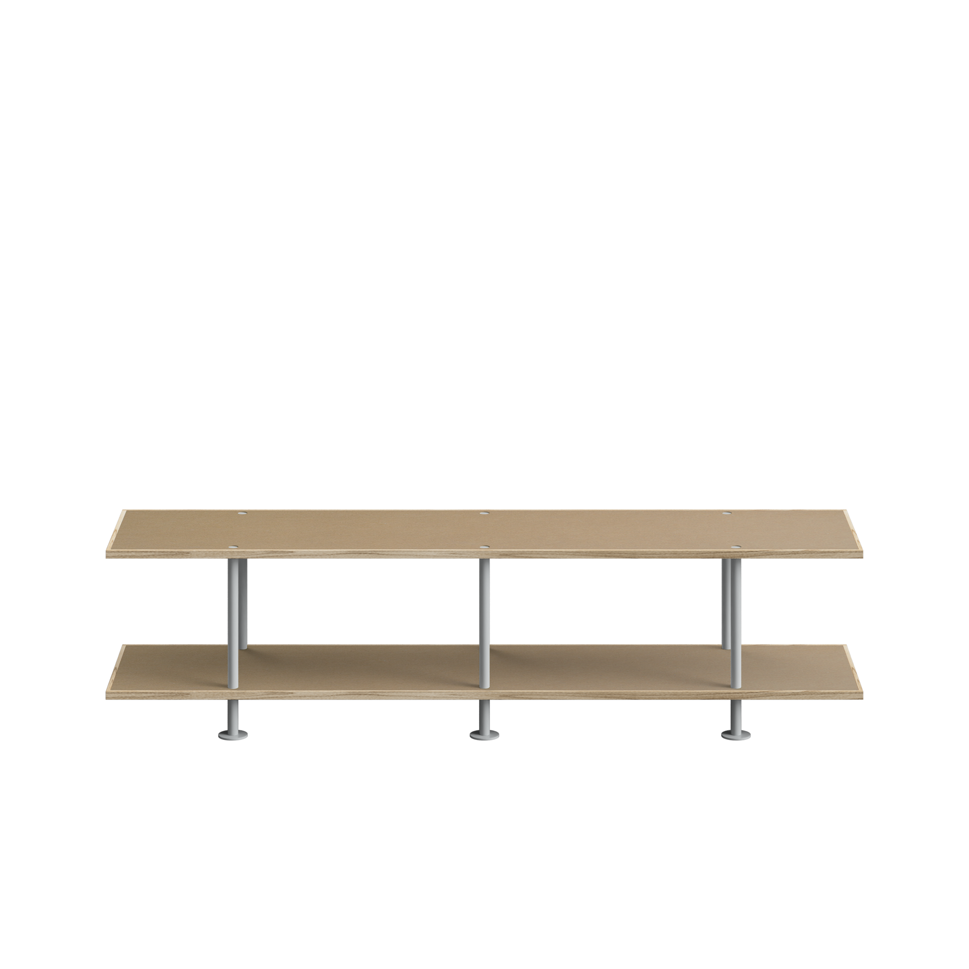 上下の支柱で棚板を挟むシンプルな構造ながら、しっかりとした強度があり、パーツの増減によって2段~4段まで組み替えが可能です。