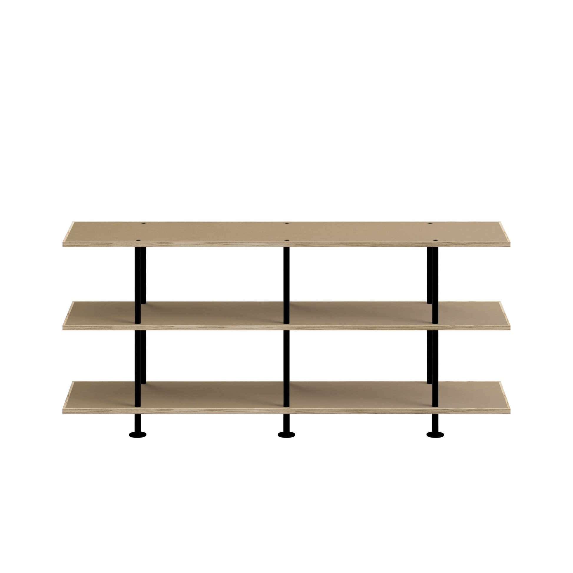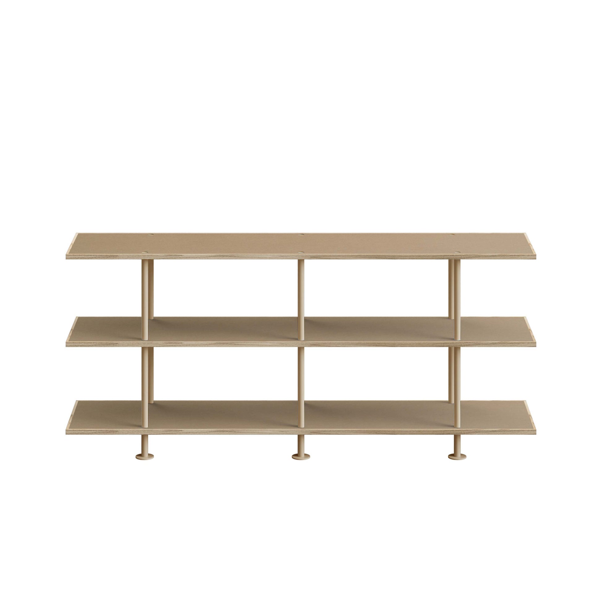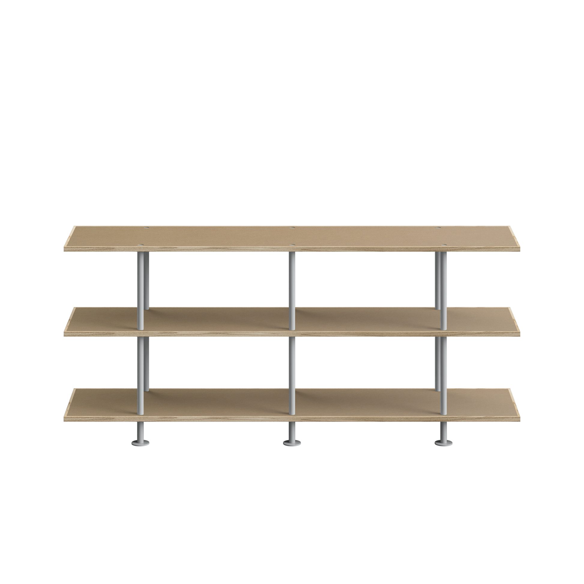上下の支柱で棚板を挟むシンプルな構造ながら、しっかりとした強度があり、パーツの増減によって2段~4段まで組み替えが可能です。