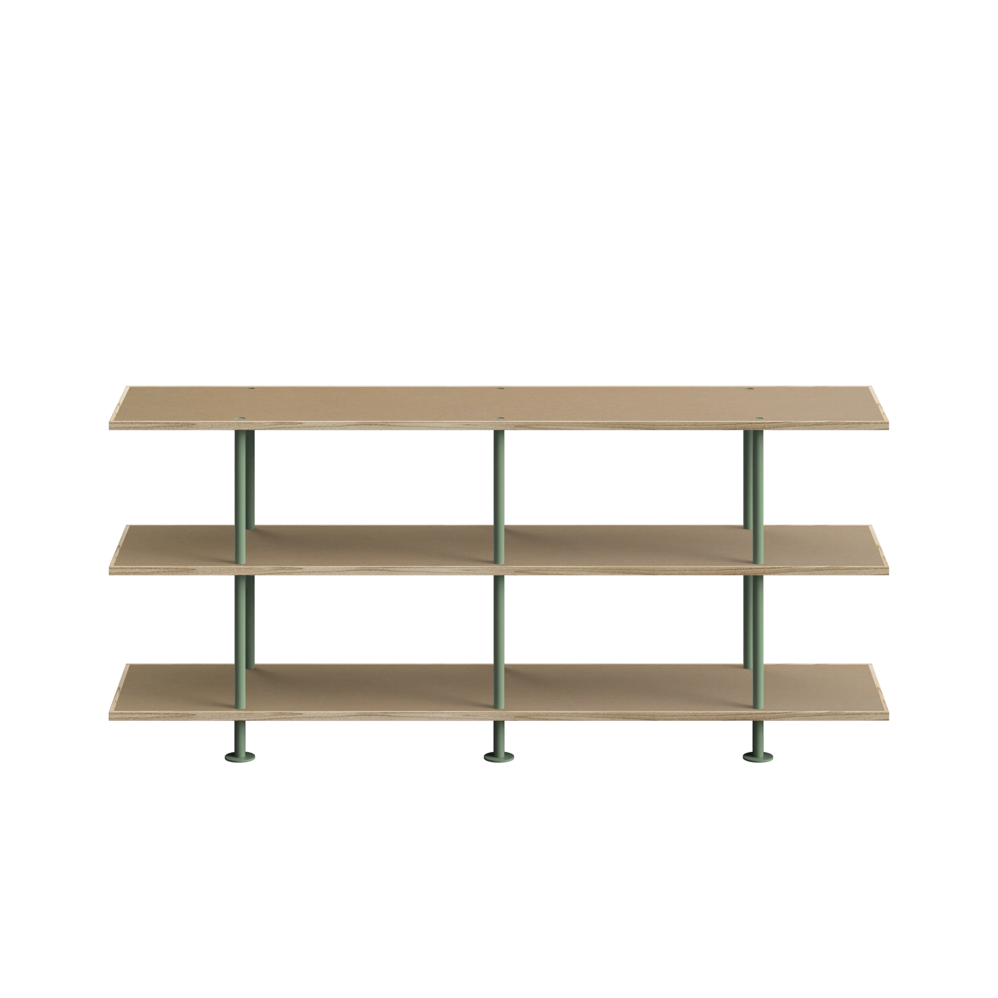 組立式のスチール脚に、カラーMDF とヒノキを使用した棚板を合わせたシェルフです。