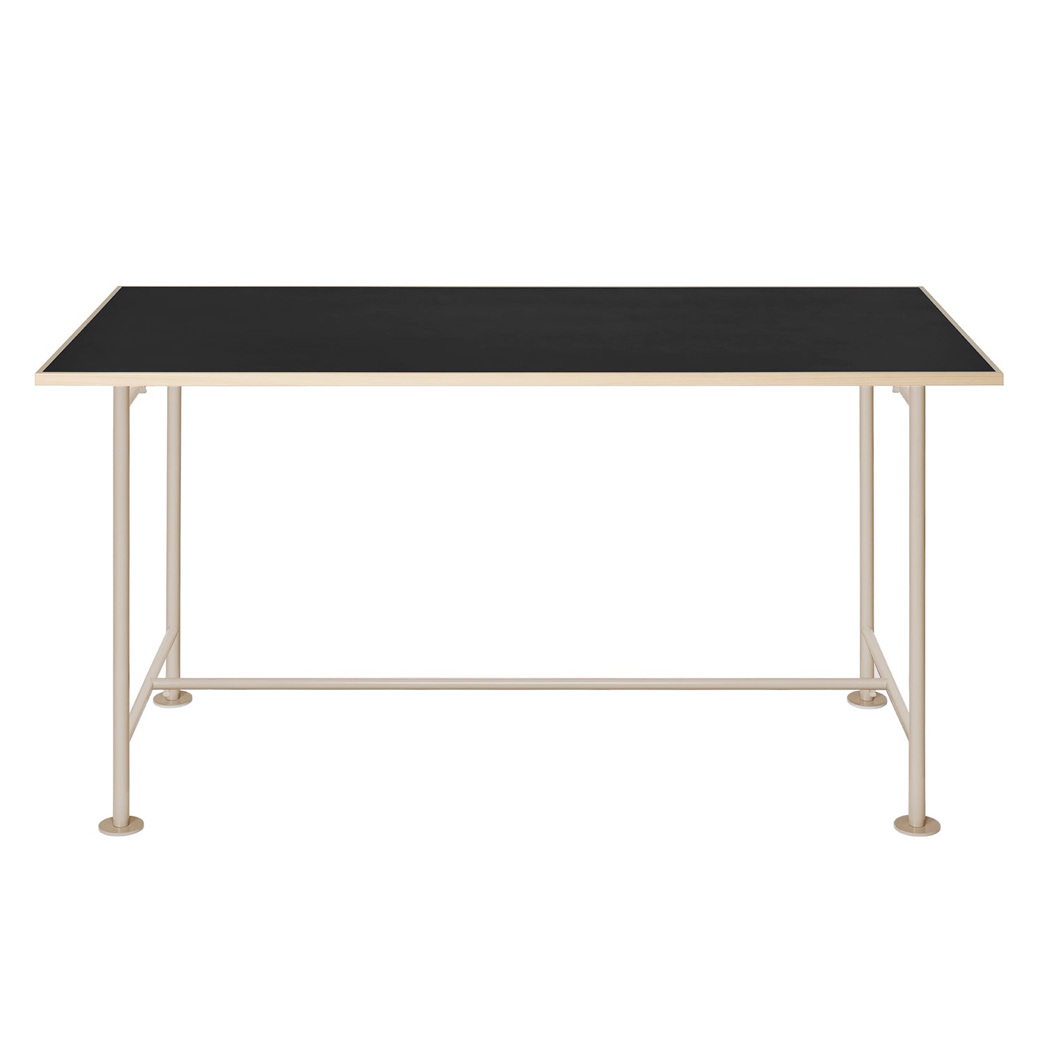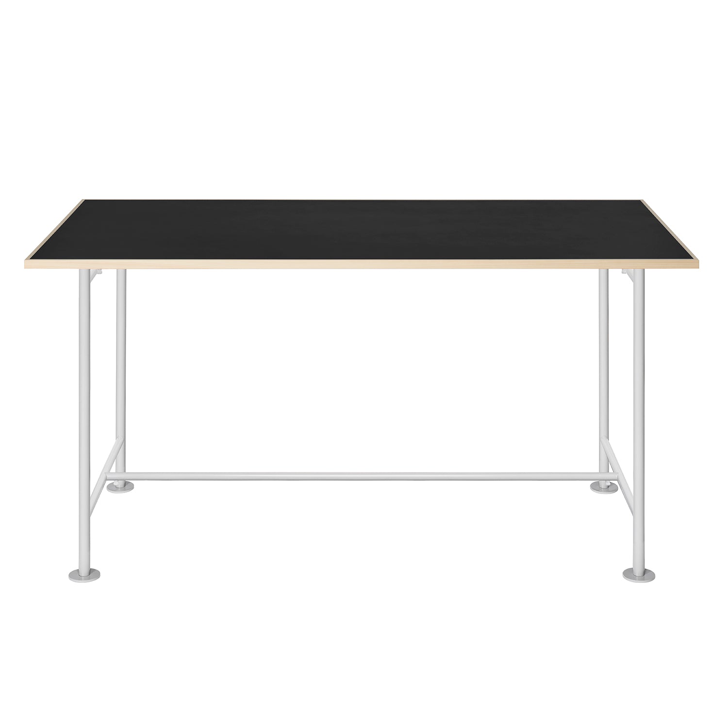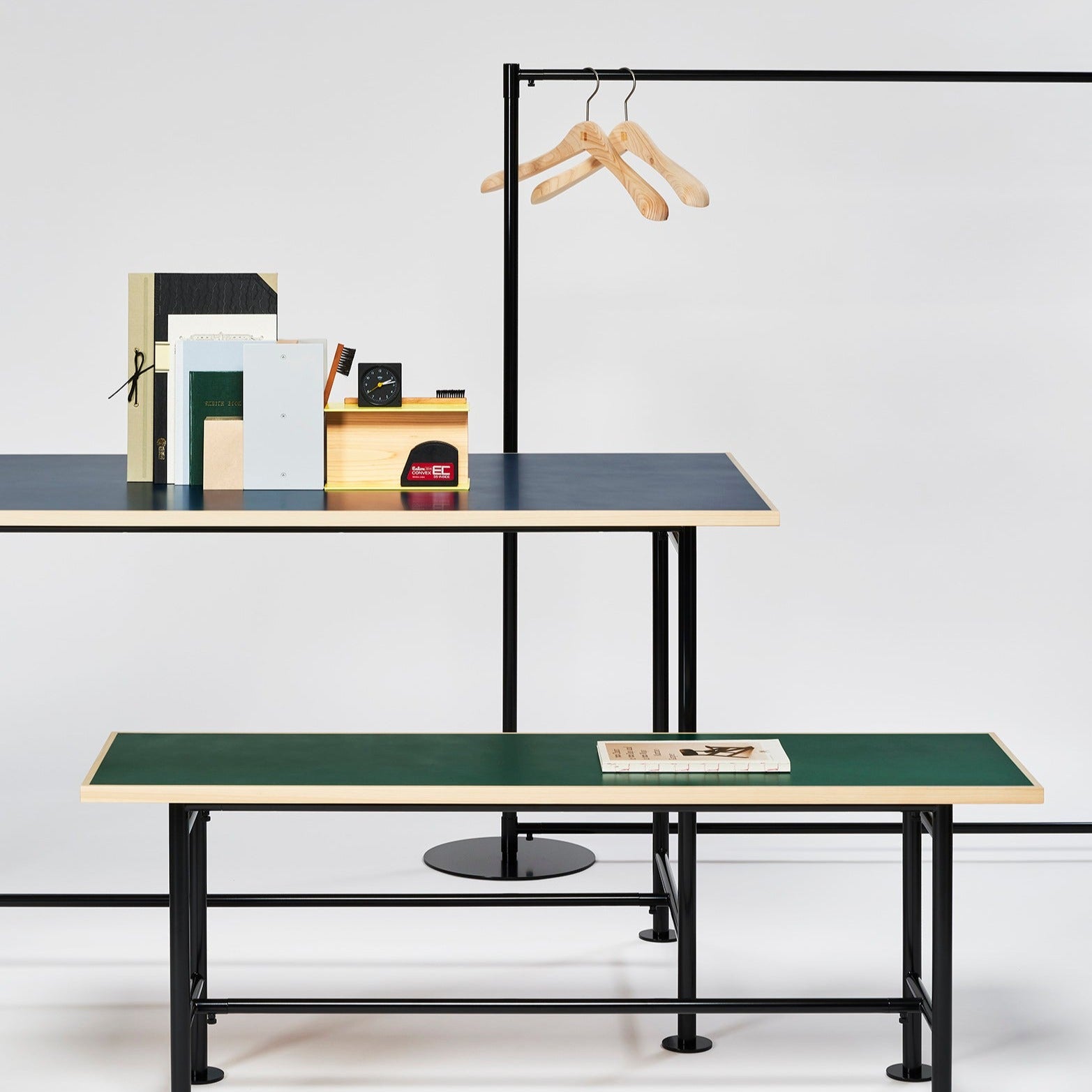 This is a table that combines an assembled steel frame with a tabletop made of colored MDF and Japanese cypress. The steel pipe legs have a simple structure yet provide sufficient strength while remaining lightweight. The base has a wide surface area to prevent damage to the floor, and the base itself acts as an adjuster, ensuring stability even on uneven surfaces. Assembly is easy, and the table can be disassembled into a flat pack, making it convenient not only for permanent use in homes and stores but also for temporary use in pop-up shops and other temporary setups.