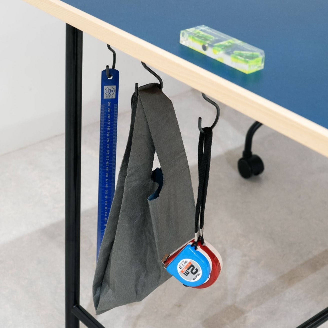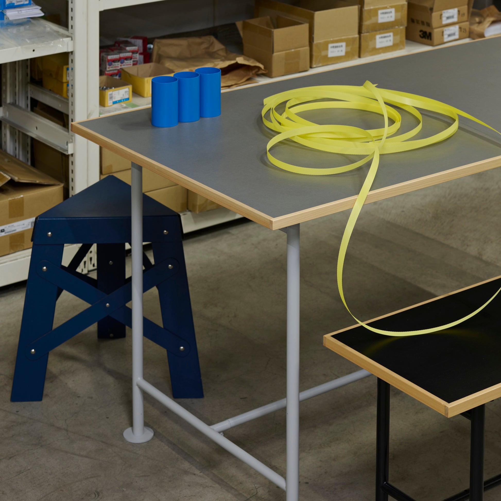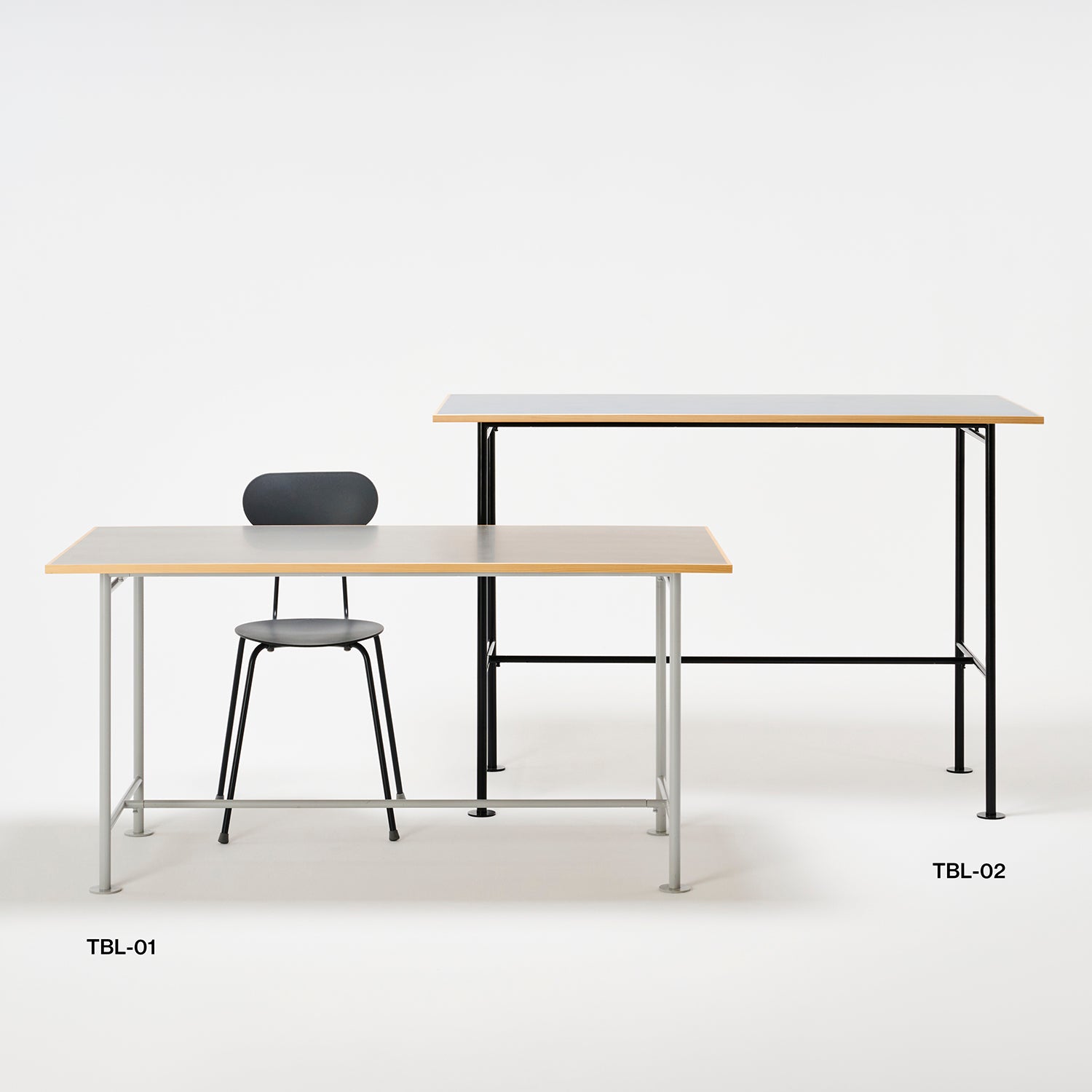 This is a table that combines an assembled steel frame with a tabletop made of colored MDF and Japanese cypress. The steel pipe legs have a simple structure yet provide sufficient strength while remaining lightweight. The base has a wide surface area to prevent damage to the floor, and the base itself acts as an adjuster, ensuring stability even on uneven surfaces. Assembly is easy, and the table can be disassembled into a flat pack, making it convenient not only for permanent use in homes and stores but also for temporary use in pop-up shops and other temporary setups.