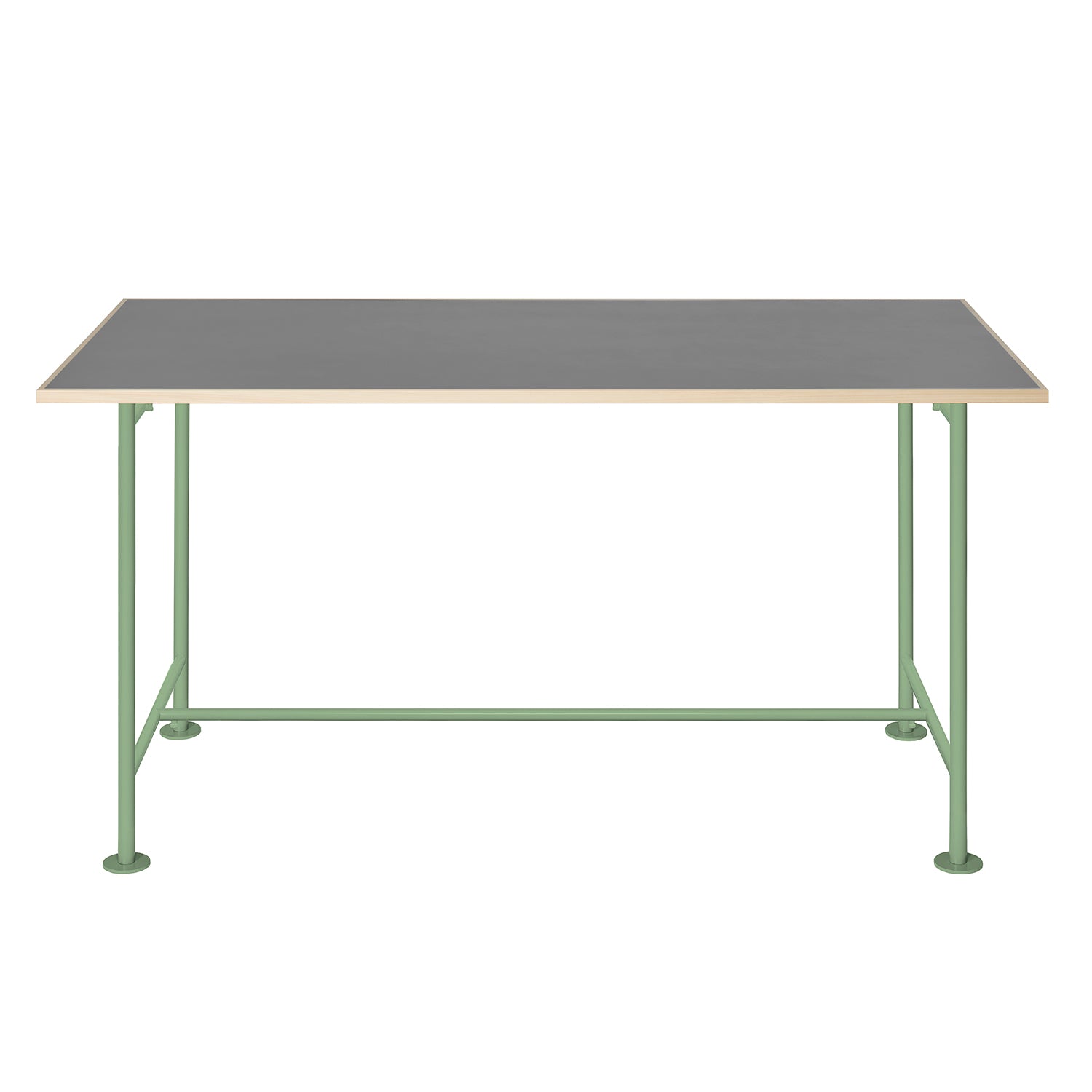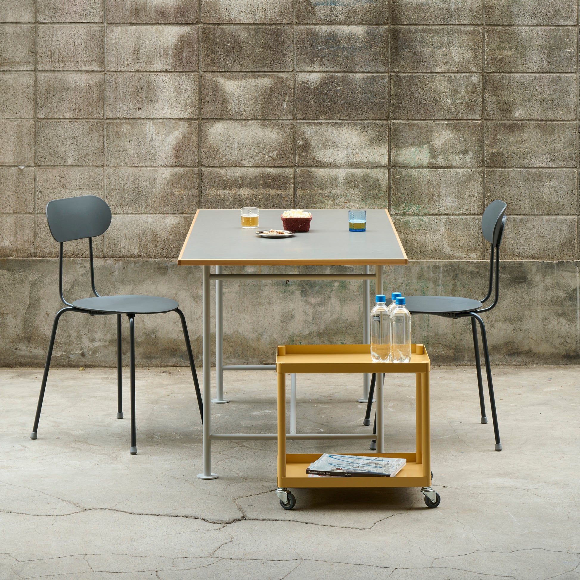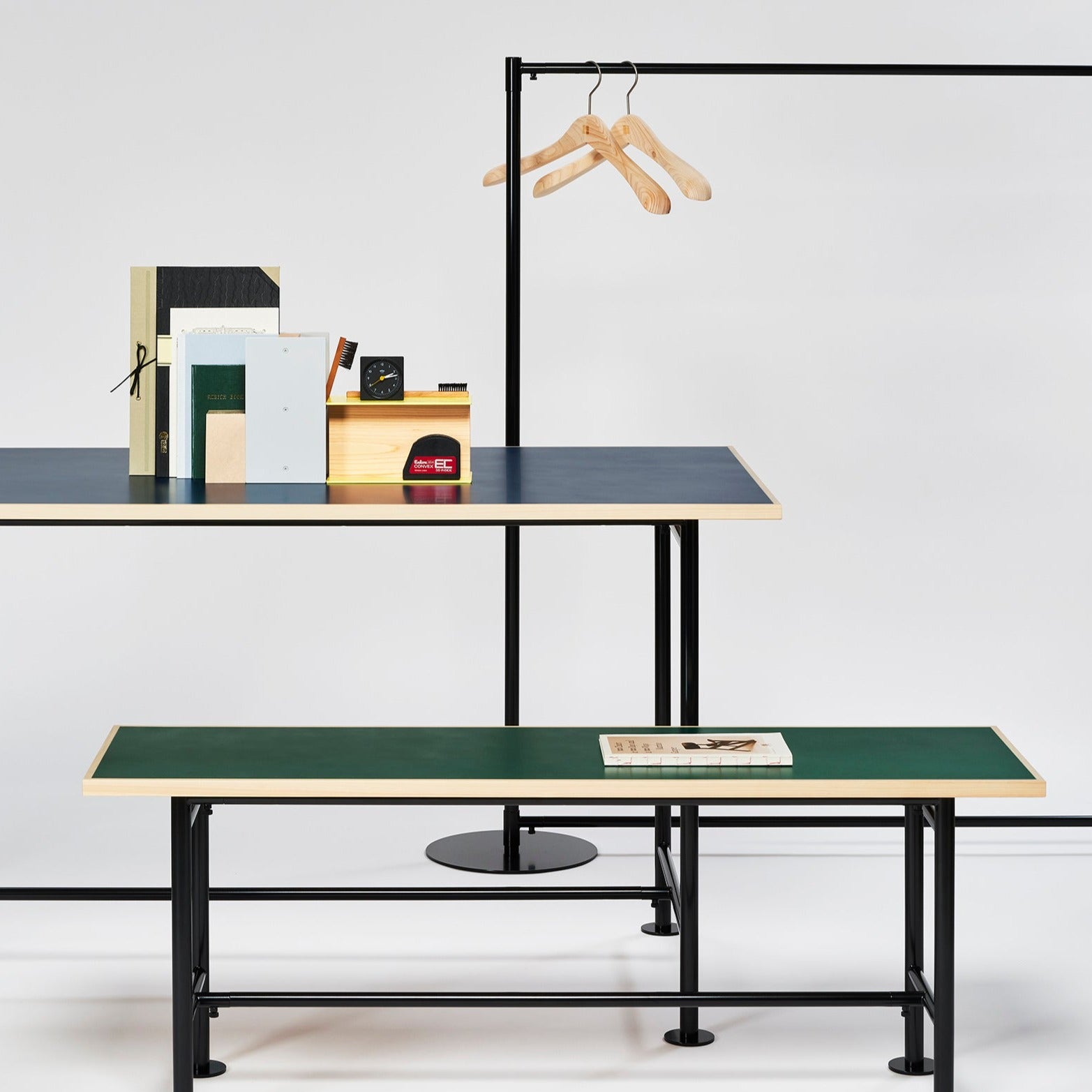 組立式のスチール脚に、カラーMDF とヒノキを使用した天板を合わせたテーブルです。