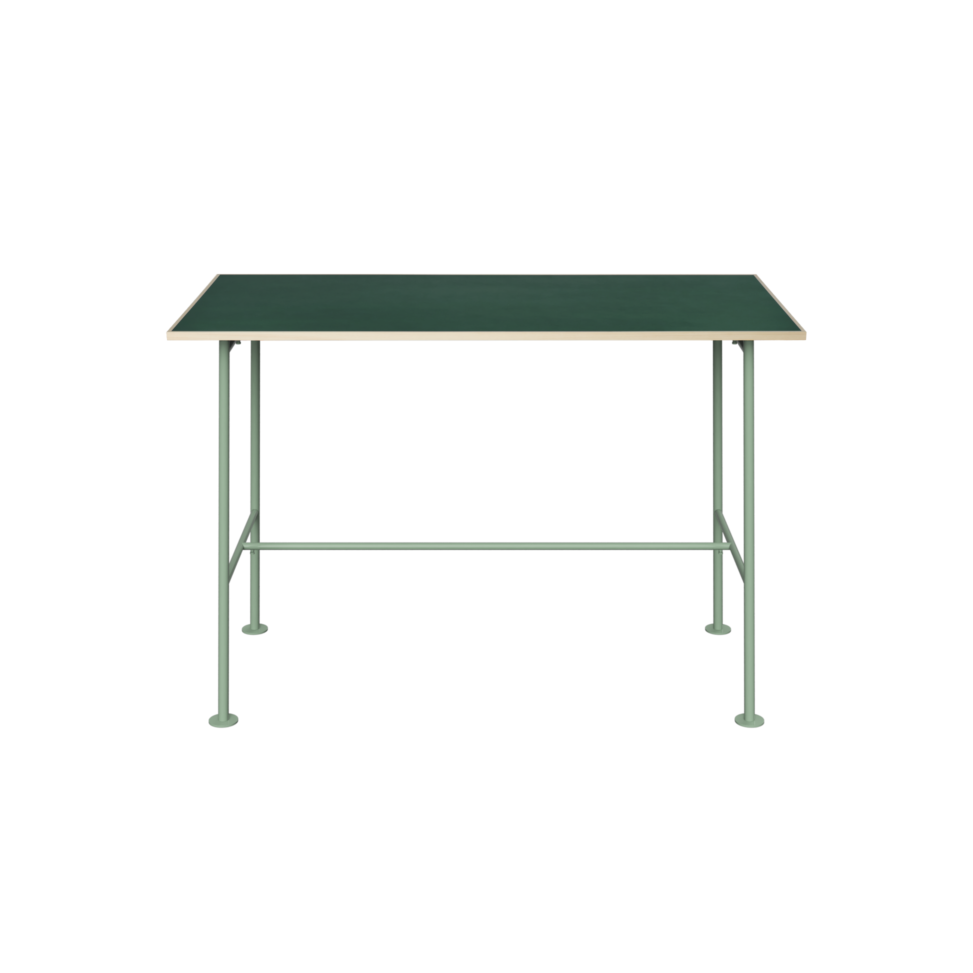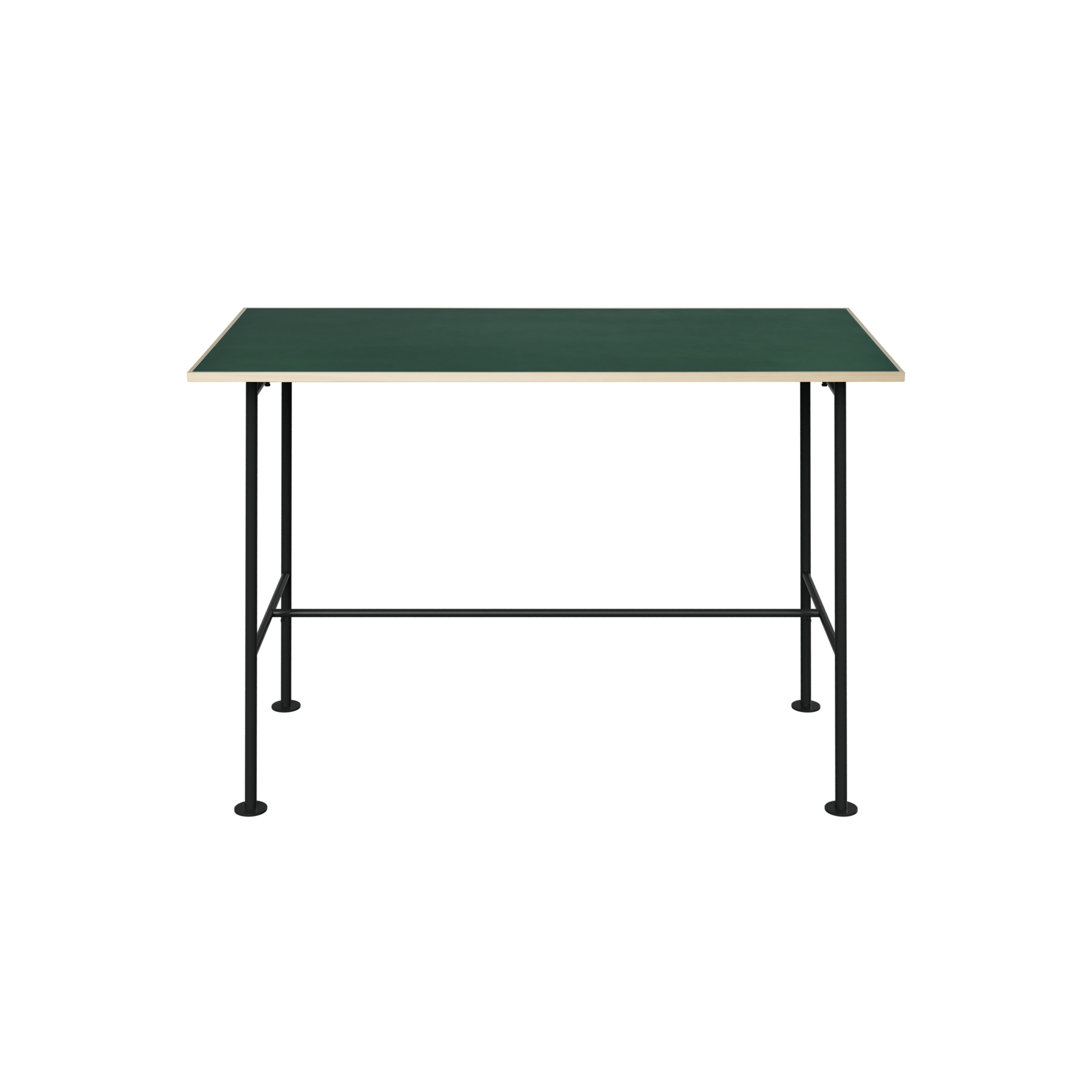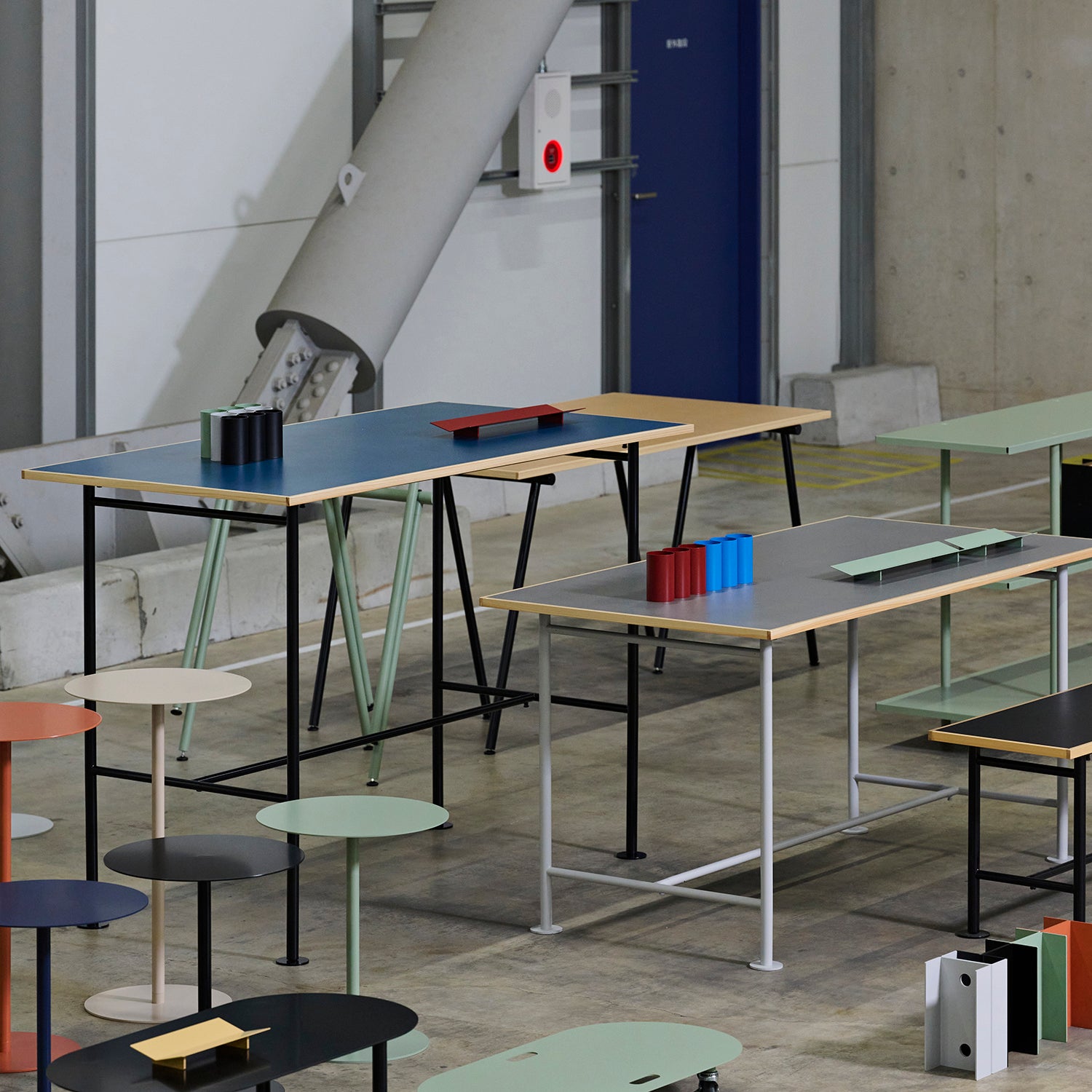組立式のスチール脚に、カラーMDF とヒノキを使用した天板を合わせたテーブルです。