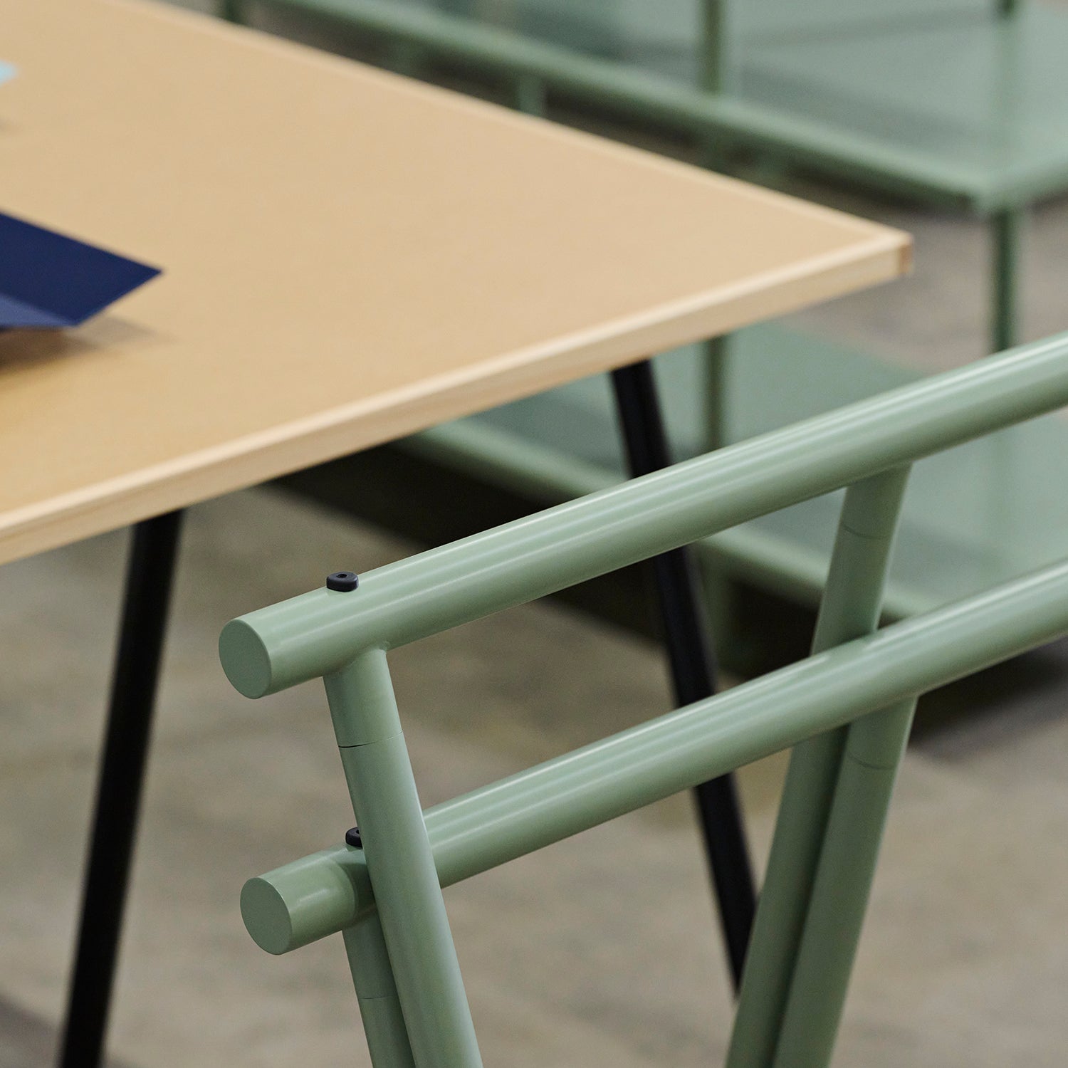 This is a 3-leg Uma leg that can be assembled without the need for tools. With three legs, you can position the two legs outward, allowing the tabletop to have an open space underneath without any obstruction from the legs. When disassembled, it becomes very compact, making it convenient for both permanent use in homes, studios, stores, as well as temporary use in pop-up shops and other temporary setups.